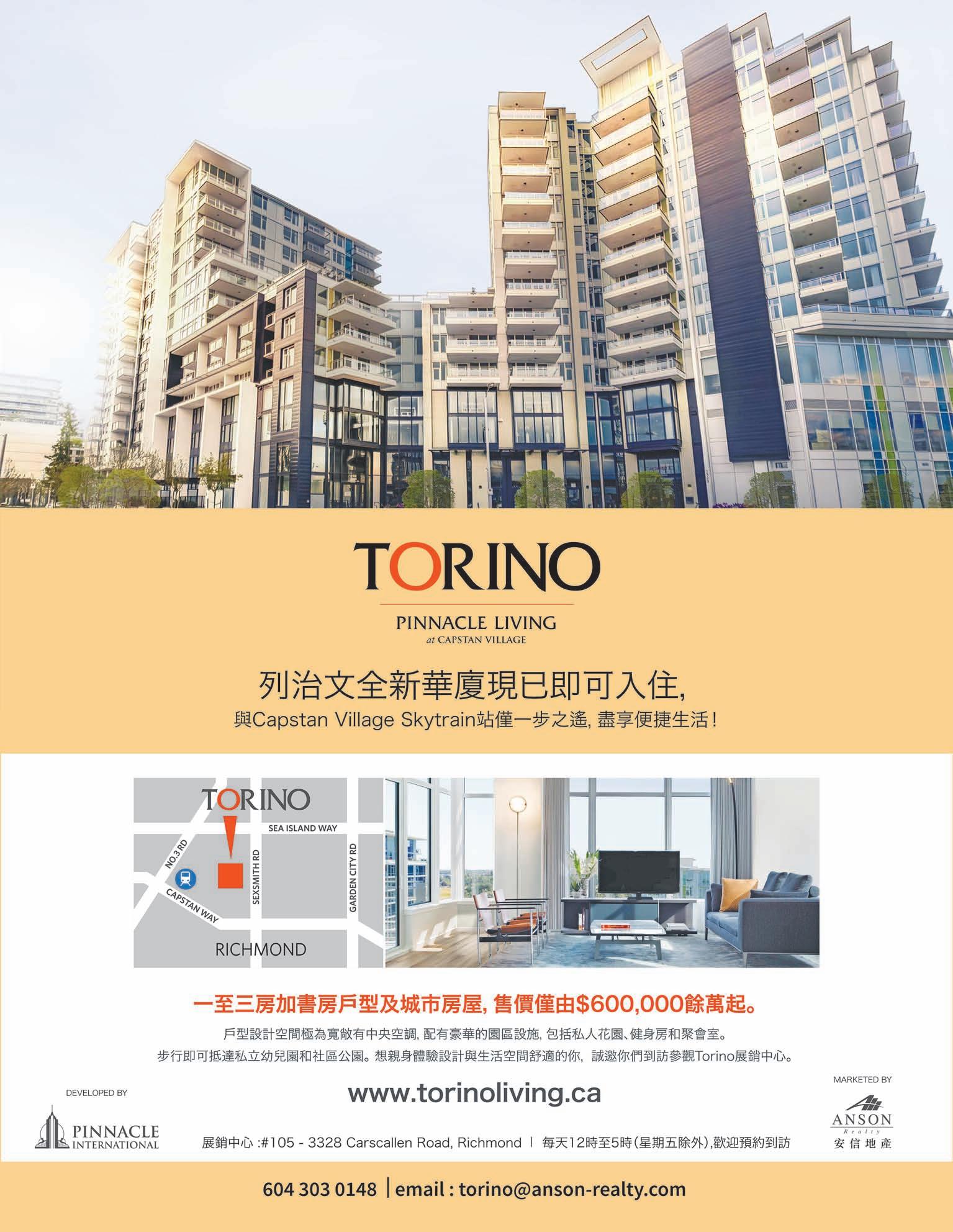 ‘ Torino’位於列治文市 West Cambie 區,3 年新水泥公寓, 3 房 + 書房 2 衛共 1,167 平方 呎,有 390 平方呎陽台。寬敞起 居室,採光明亮,空調設備,木 地板。1 車位和自行車存放室, 交通購物極為方便,可步行到 餐館、超市、銀行和 Capstan 未來加拿大線天車站。