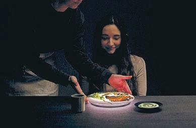 吃光體驗 隨着科技進步,燈飾不止於照明作 用,如由意大利/泰國設計工作室Habits推出 的Light Bites,便將燈光和感應器注入餐具, 燈光會因應食物作出反應,營造出沉浸式用 餐體驗。