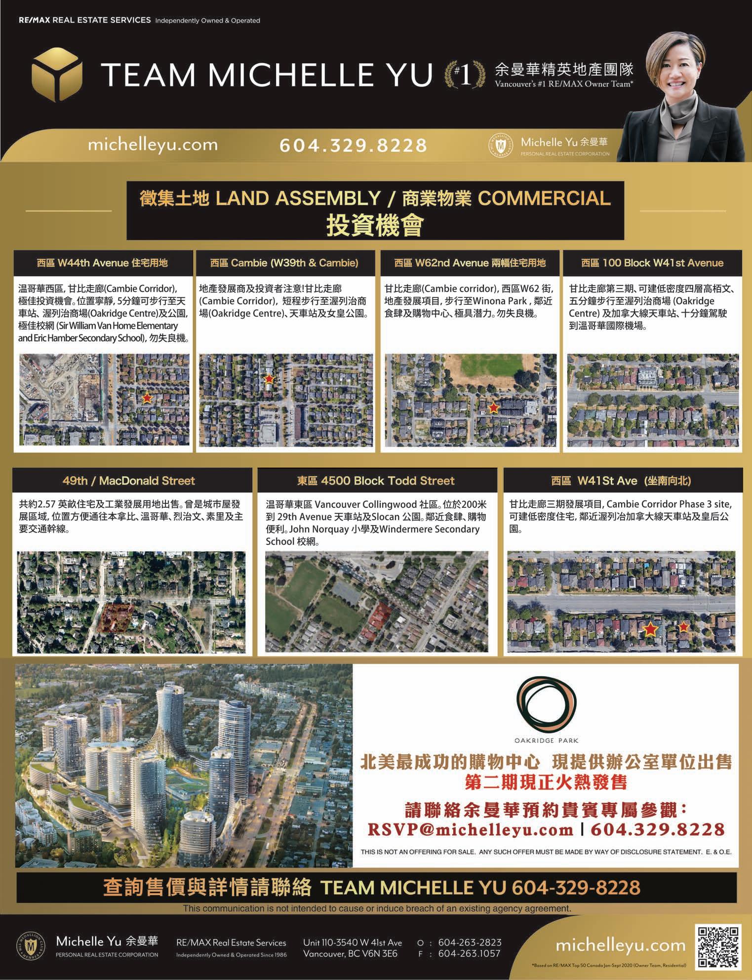 土地面積:40,870SqFt. 用途:4FSR12 層出租建築 緊鄰 Oakridge 購物中心、 伊莉莎白公園、 范杜森植物園、 天車 41 街站。