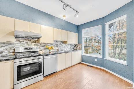 溫西 Fairview 中心地段,優越地理位置,三層連排別墅, 單邊單位,3 房 2 衛共 1,399 平方英尺。優越位置,體驗 都市生活環境,飽覽福溪的水景、山景和城市景。寬敞空 間,室內採用明亮的開放式設計,木地板,並有 350 平方 英尺私人屋頂露臺,可 360 度飽覽壯麗景色,是休閒娛 樂的理想場所。底層設有獨立門戶,一間寬敞的臥室和 一間全套衛浴,非常適合招待客人或用作家庭辦公室。 專業廚房配備花崗岩檯面,不鏽鋼電器和早餐吧,可俯 瞰開放式起居和用餐區。樓上設有一間寬敞的主臥,配 備步入式衣櫥,另有一間次臥。1 個儲物櫃和一個安全停 車位,可直接通往房屋內部。鄰近 FalseCreek 和 GranvilleIsland,步行可到達 OlympicVillage 、海堤、公 園、學校。附近有天車站和即將開通的地鐵,交通便利。