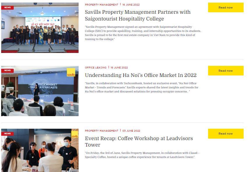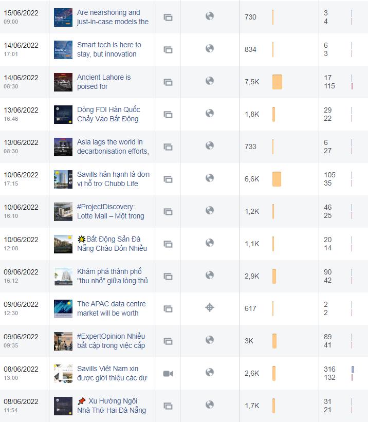 • Real estate overview took the lead and accounted for 37% of the overall articles. Most of Savills and CBRE's articles in this segment wrapped by the real estate supply predicted to be rare in the second half of 2022, housing prices continue to rise unless demand improves, and ASIA - Pacific trade volume could increase by 5 - 10% in 2022. Savills outperformed with Su Ngoc Khuong’s statements about the change of ownership laws, Neil MacGregor’s participation in the VN Economic Forum, Trang Vo’s statements on real estate market H2 22, Korean FDI flow into Vietnam…