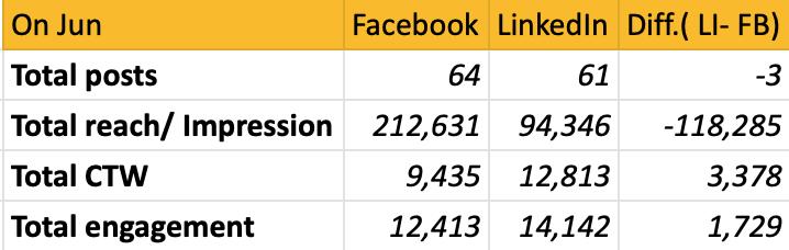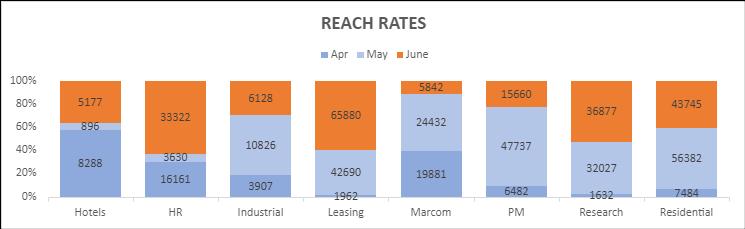 In June, Linkedin performed better than last month with posts about Leasing & Research, while FB reached more than Linkedin thanks to posts about recruitment and Leasing that spoke to a wider audience. However, engagement and clicks to web are higher on Linkedin, which means that Linkedin’s audience is a better fit for our business.