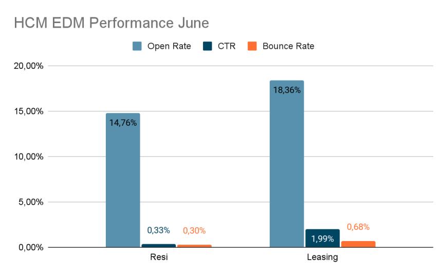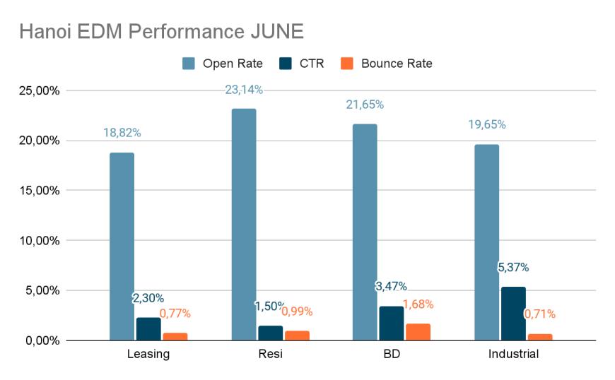 EDM HIGHLIGHTS (HANOI) Title Leasing Resi BD Industrial No. EDM 4(+3) 1(0) 1 1(-3) Total delivered 11,899 21,219 5,705 1,695 Openrates 18,82%(-0,7%) (+7,1%)23,14% 21,65% 19,65% (9,7%) Click rates 2,3% (-0,4ppts) (+0,12ppts)1,5% 3,47% (+2,1ppts)5,37% Bounces 0,77% 0,99% 1,68% 0,71% On this month we delivered 26 eDM in Total including Hanoi(7), HCM(15) & National (4). June eDMs continue doing Retargeting Strategy applied for Residential and Industrial. Residential slightly decrease in Open Rate and Click Rate mainly because of the mass data sending. Leasing Ha Noi comebacks with 1 eDMs/week and shows good performance with stable performance as the Leasing data is very good in quality but it needs to update regularly and should apply Retargeting Strategy. BD data is quite qualified as the Open Rate remains at highest among Departments’ benchmark. Research S22M email shows increasing in both Open and Click Rate but this is just the retarget with scale of only 562 users. EDM HIGHLIGHTS (HCMC) Title Resi Leasing No. EDM 14(-5) 1(-2) Total delivered 487,998 11,899 Open rates 14,76% 7,84ppts)(- (+4,63%)18,36% Click rates 0,33% (-0,3ppts) (+0,34ppts)1,99% Bounces 0,3% 0,68% EDM HIGHLIGHTS (National) Title Resi Research No. EDM 3 1(-2) Total delivered 357,422 562 Open rates 11,2% 29,45% (+10,95%) Click rates 0,63% (+10,88ppts)13,4% Bounce rates 0,36% 5,8%