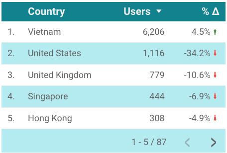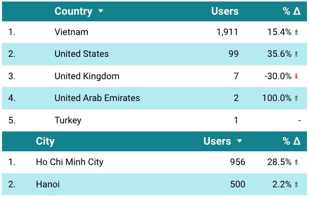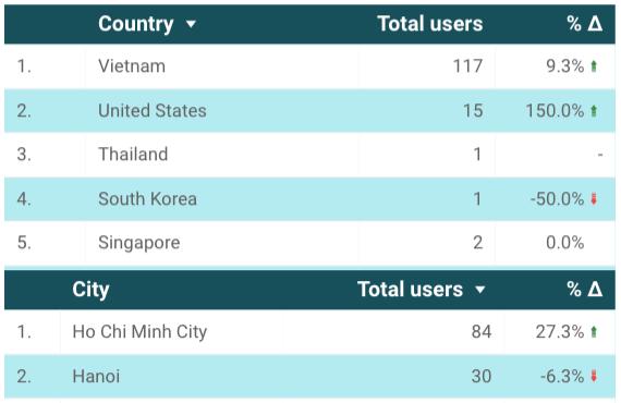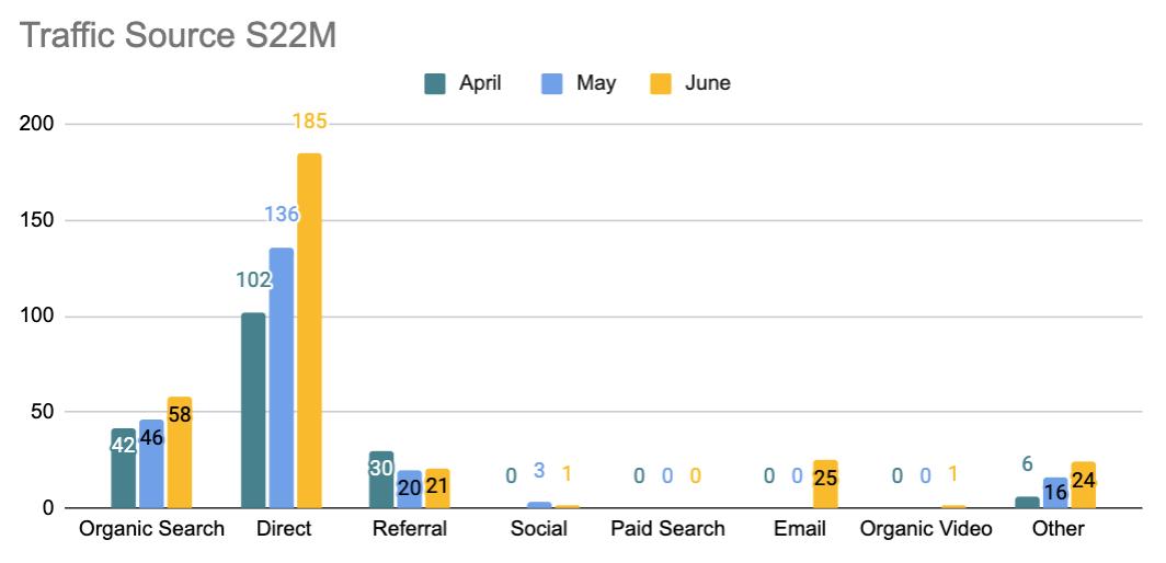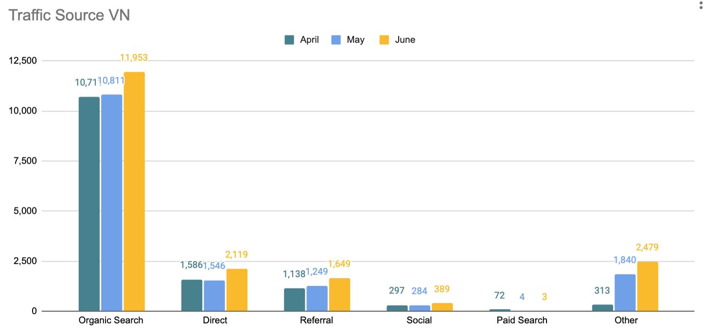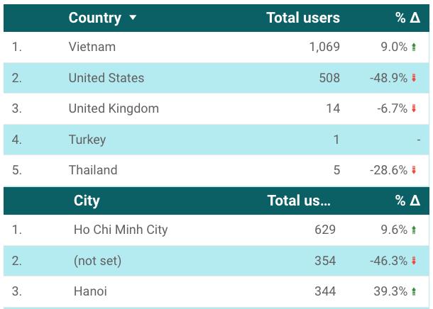 Compared to last month, the traffic to S22M increased in terms of users and sessions, pageviews, despite decrease of QMR. S22M launching campaign June-July should keep increasing traffic to S22M over the next weeks. Most of traffic source is direct (+ 40.4 %), organic search (+ 57.4 %). Most traffic are from Vietnam (+9.3%) and HCMC (+27%).