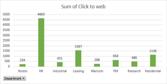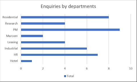We are systemizing of collecting and tracking customer enquiries via our digital channels. In June, we served 44 inquiries as below: - Most of the inquiries come from Savills Fanpage (62%), eDM (16%). Fanpage received 24 new messengers, mostly related to PM and HR. Most of inquiries are request to know more or ask for general information (48%) We generated 17 leads (38%) for Residential sale (4), Industrial (6), Leasing (4) and Research (3) via all Channels. Number of complains decreased when compared to last month. Number of enquiries by departments Customer enquiries via digital channels