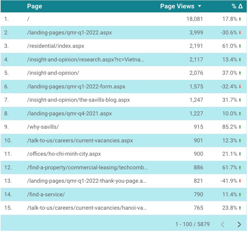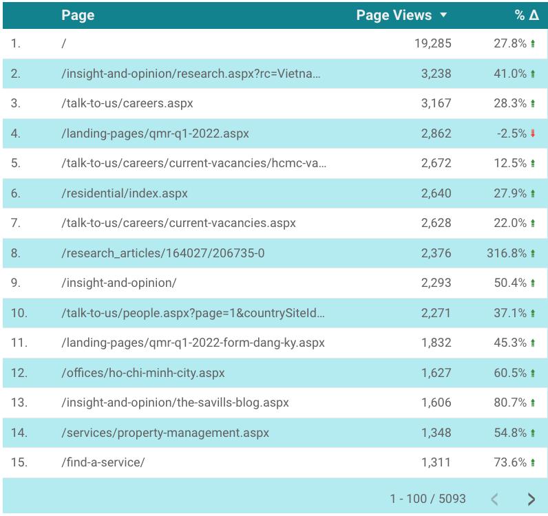 TOP VIEW PAGES - EN (01/06 – 31/06) English website: The content of pages belonging to Research and Residential Departments are the most pageview on this month. WEBSITE UPDATE (HANOI - HCMC) No. Page Pageviews Avg. Time on Page Department 1 QMR Q1 3999 24 Research 2 Residential 2191 29 Residential 3 Research blog 2117 17 Research 4 Insight and Opinion 2076 14 Research 5 Form QMR Q1 1575 26 Research 6 Blogs 1247 23 Research 7 QMR Q4 1227 39 Research 8 Why Savills? 915 38 Marcom 9 Vacancy 901 3 HR 10 Ho Chi Minh Office 900 26 Marcom