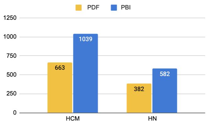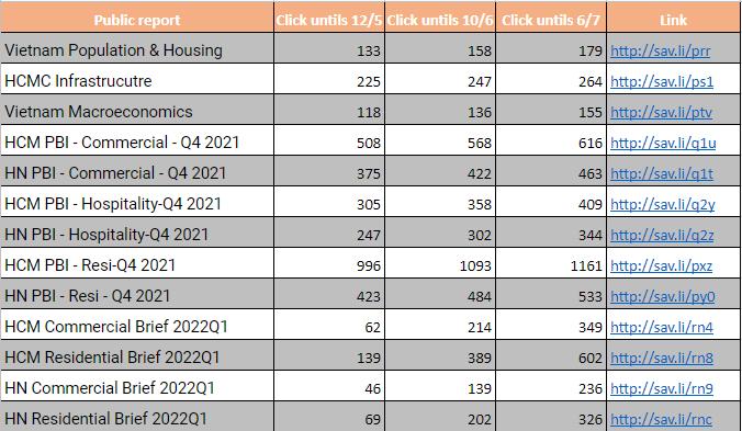 The latest PBI reports recruited traffic more strongly than the previous ones. Till now, the PBI report which has the most total clicks is HCM Residential Brief 2022Q4. However, HCM Residential Brief 2022Q1 grew quicker with 213 new clicks (+54.7%) compared to May. Sectors that seem to interest our audience are : Residential 1st, Commercial 2nd and Hospitality 3rd, HCM market more attractive than HN market. PBI reports clicks higher than QMR PDF downloads. *As we can not set time range to calculate traffic to PBIs so from next months, we will choose the first day of month to take the data. Q1 2022