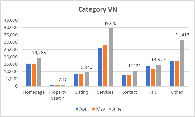 MONTHLY HIGHLIGHTS SAVILLS WEBSITE PAGEVIEWS BY DEPARTMENTS (01/06 – 30/06) June witnessed the creation of a user-friendlier homepage + optimized service pages, which seemed to bring good results as pageviews of Homepage + Services much higher than last months. SEO efforts also seemed to pay off as pageviews of all services, esp. Advisory, Resi, Leasing, increased on VN website (as still focused on VN keywords since ENGVNESEMay).