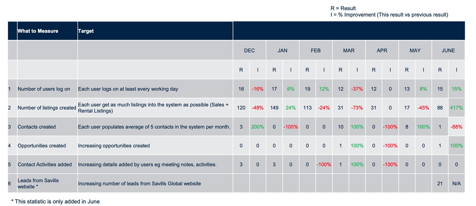 R3 monthly performance Vietnam - Residential Cube On Jun, based on R3 usage stat in Vietnam: - Average 15 agents active monthly on R3, mostly in HCMC - 15 active agents listed about 88 properties, about 6 listings/ agent These listings recruited about 490 pageviews on website Savills Search properties via 78 entrances, about 7 pageviews/ entrance. Generated 21 leads, about 1,5 leads/ agent, about 4 listings/ lead. Less contact created and no contact activities was tracked that sales are not willing to update contacts and their leads caring status. Suggestions: Increase number of active agent and listing / agent indicator *data from Regional R3 team *data from Google Analytic - Search Properties in Vietnam