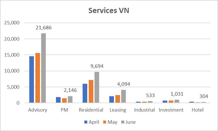 • Residential for sale gained a significant rise at 14% in comparison to last month, witnessed the outperformance of CBRE with nearly doubled of volumes than Savills. This segment featured CBRE as the key management and operation at Diamond Crown Hai Phong and Salto Residence, while Savills focused on analyzed difficulties of the real estate market and solutions in Vietnam. At present, Colliers also performed better in this business line, asserting that commercial shophouses were a sustainable product with approximately 12% profit, and the value increment might reach 15 30% each year.