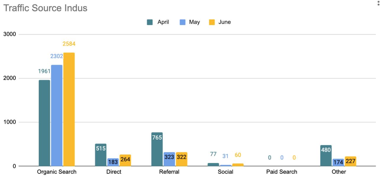 SEO efforts still very high as traffic from organic search continuously increased from April ~+15% each month and pageviews also highly increased (5/10 top pageviews are blogs). Indus website generated 5 leads on this month.
