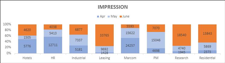 SOCIAL MEDIA – LINKEDIN (01/06 - 30/06) Title Hotels HR Indus Leasing Marcom PM Research Resi TOTAL Total Post 1 2 4 14 3 5 21 11 61 Evol vs May 0 -1 -2 7 -11 -1 16 6 +14 Impression 4620 4038 6877 33765 5593 7070 18540 13843 94346 Evol vs May 3115 -1375 -460 24073 -10029 -7976 13800 7974 +29122 Click to web 1837 996 298 6432 538 717 434 1561 12813 Evol vs May 1805 804 -386 5053 -460 -2394 -203 902 +5121 Engagement 1902 1035 412 6886 618 842 679 1768 14142 Evol vs May 1857 759 410 5377 617 2489 2 1036 +5515 As the number of total post is higher than last month and strongly increased Reach, CTW and Engagement compared to May. In June, the total Reach increased significantly compared to last month. The Engagement is double than the previous months as the content and visual are really improved in June (timing also impacts). Click to web are also double than May. Leasing rocketed in both impression, click and engagement versus last month due to the rise in number of posts (as ⅓ of the impression , ½ click, and more than ½ engagement come from Leasing posts).