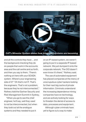 on an IP-based system, we weren’t going to put in a separate IP-based network. We just dumped it onto the corporate network. The CIO doesn’t even know it’s there’,” Rothery said. The use of automated equipment has placed companies at the mercy of unscrupulous cyber hackers looking for their next big cache of private information. Criminals understand the increasing dependence mining companies have on technology, and are actively looking for ways to threaten the denial of access to data, processes and equipment. Although cyber criminals have yet to figure out a way to make 29