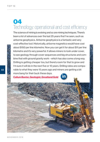 Technology: operational and cost efficiency The science of mining is evolving and so are mining techniques. There’s been a lot of advances over the last 25 years that I’ve seen, such as airborne geophysics. Airborne geophysics is a fantastic and very cost-effective tool. Historically, airborne magnetics would have cost about $150 per line kilometre. Now you can get it for about $11 per line kilometre and it’s very powerful. It allows miners to look under cover, to see geology through cover sequences and big structures and combine that with ground gravity work – which has also come a long way. Drilling is getting cheaper too, but there’s room for that to grow and I’m sure it will do in the next five or 10 years. Drilling rates are compa60