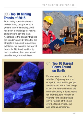 08.) Top 10 Mining Trends of 2015 From rising operational costs and declining ore grades to a general lack of financing, 2015 has been a challenge for mining companies to say the least. According to the annual “tracking the trends” report by Deloitte, the struggle is expected to continue. In this list, we examine the top 10 trends for 2015 as identified by the consultancy firm, and reveal possible long-term solutions.