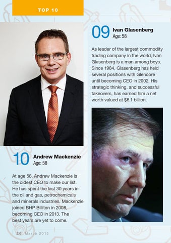 At age 58, Andrew Mackenzie is the oldest CEO to make our list. He has spent the last 30 years in the oil and gas, petrochemicals and minerals industries. Mackenzie joined BHP Billiton in 2008, becoming CEO in 2013. The best years are yet to come. 26 March 2015