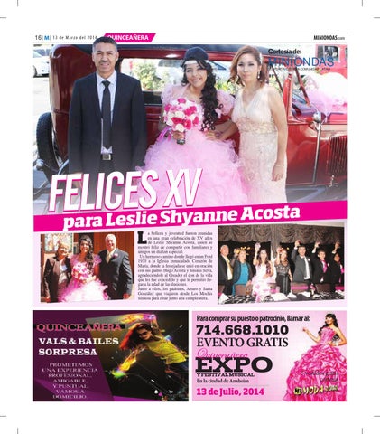 a t s o c A e n n a y h S e para Lesli L a belleza y juventud fueron reunidas en una gran celebración de XV años de Leslie Shyanne Acosta, quien se mostró feliz de compartir con familiares y amigos un día tan especial. Un hermoso camino donde llegó en un Ford 1930 a la Iglesia Inmaculado Corazón de María, donde la festejada se unió en oración con sus padres Hugo Acosta y Susana Silva, agradeciéndole al Creador el don de la vida que les fue concedido y que le permitió llegar a la edad de las ilusiones. Junto a ellos, los padrinos, Arturo y Santa González que viajaron desde Los Mochis Sinaloa para estar junto a la cumpleañera.