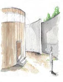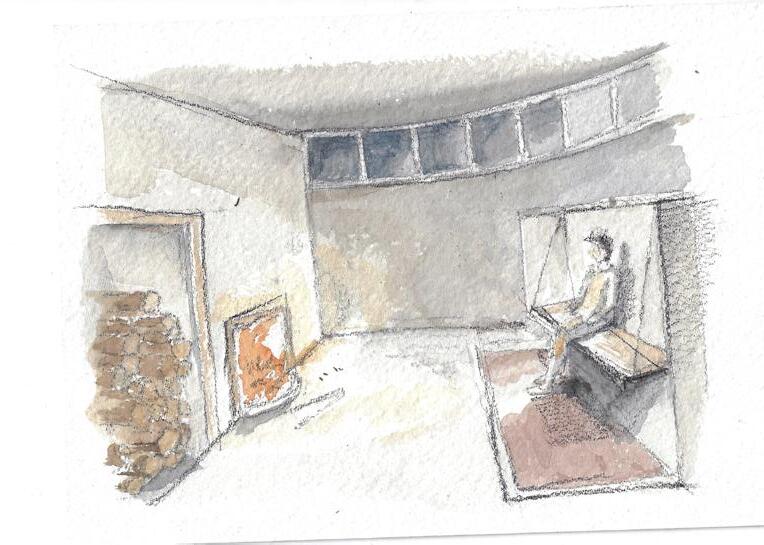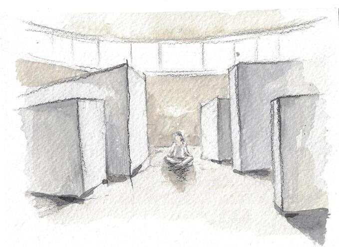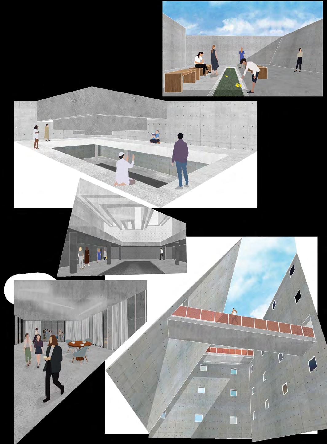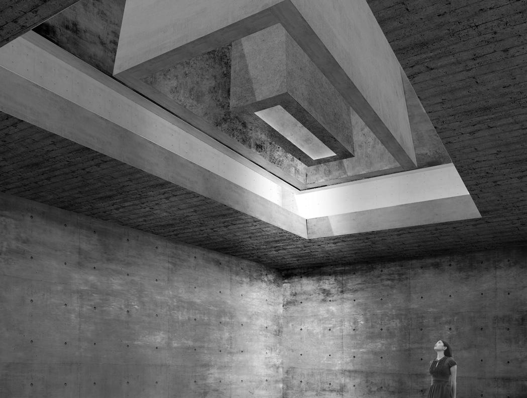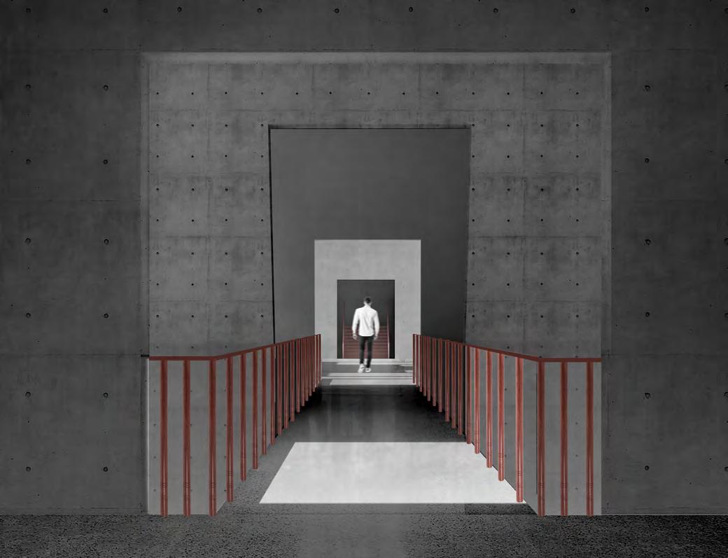 The atmosphere of the preparation space passing before reaching the main hall. Through the use of limited materials and simple structures, a calm atmosphere can be created and preparation time can be taken.