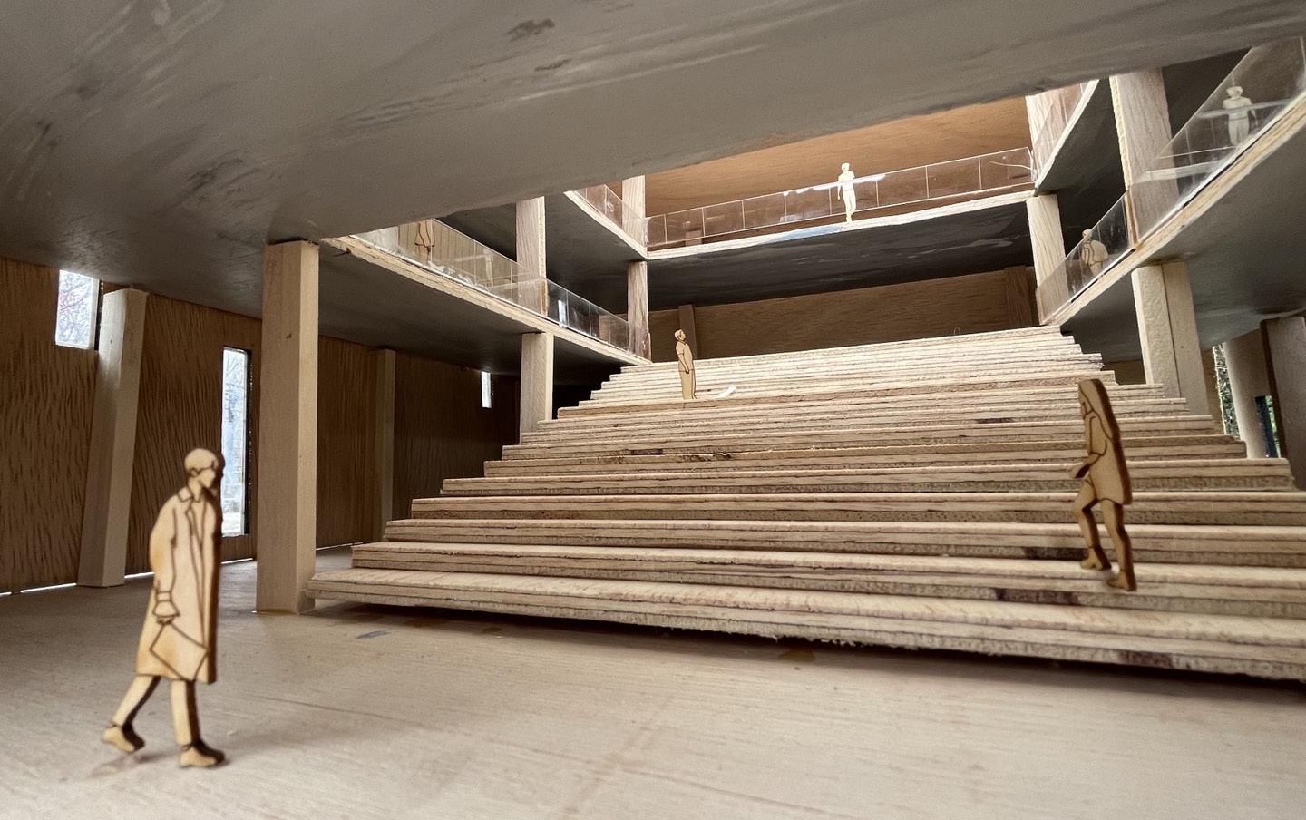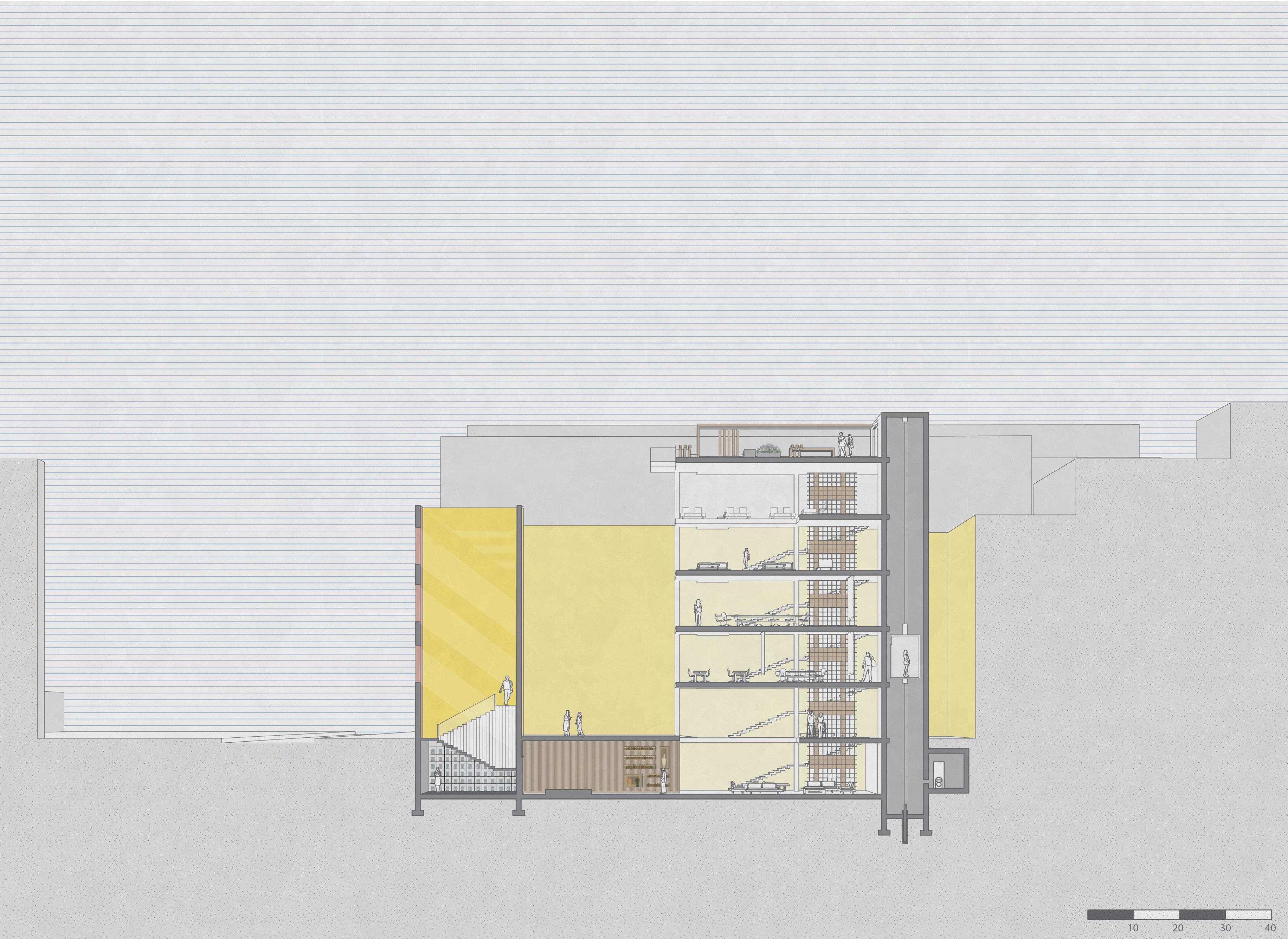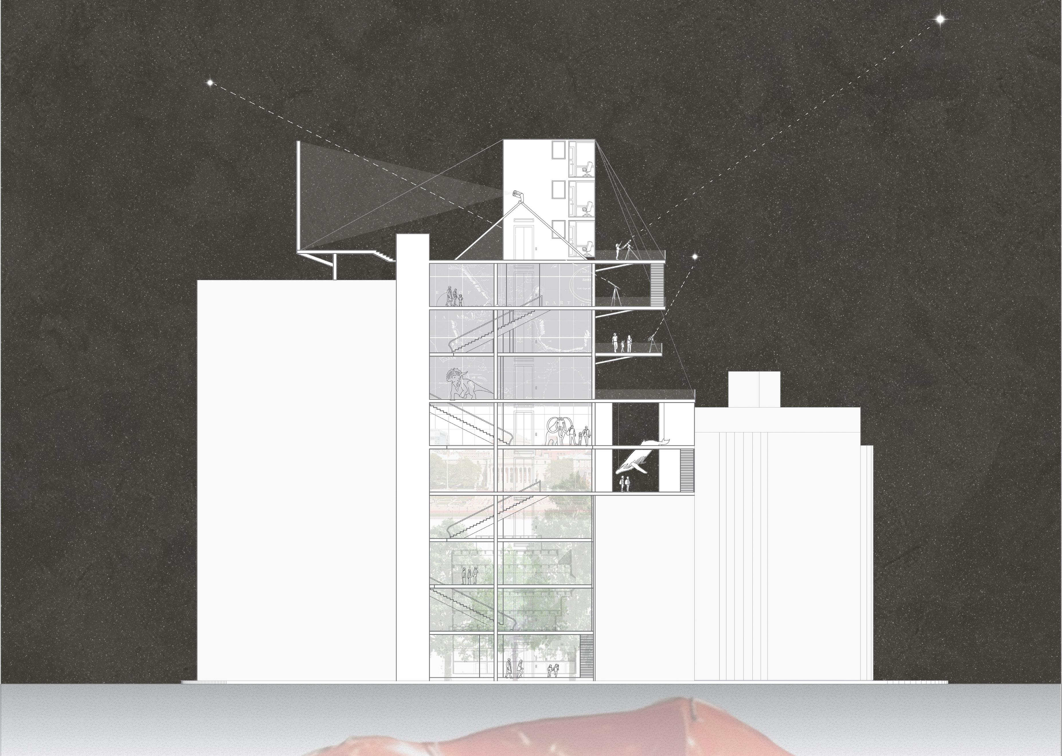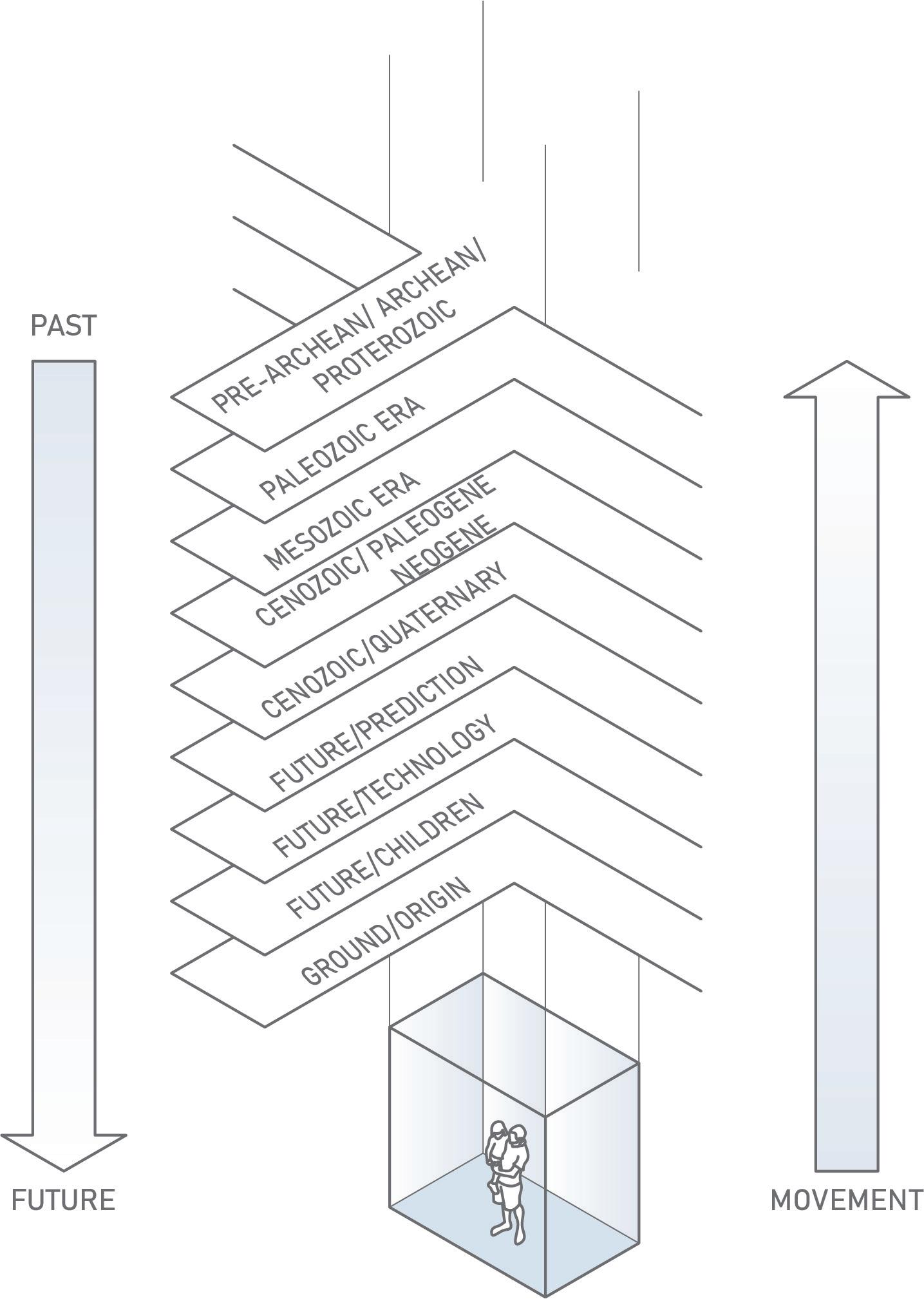 Occupants can take the elevator, which symbolizes technology and education in this cenotaph, to get to the top floor. They could reach the origin of the Earth, which is located near the sky and space. As they move down the building, they get closer and closer to the present time, where they exist. Then, they move into the floors of the future, where children can make their own artifacts and leave marks in Anthropocene history. The journey’s final destination is the auditorium - the basement - which represents Earth, the genesis of the whole history. This journey ends with a cyclical cycle.