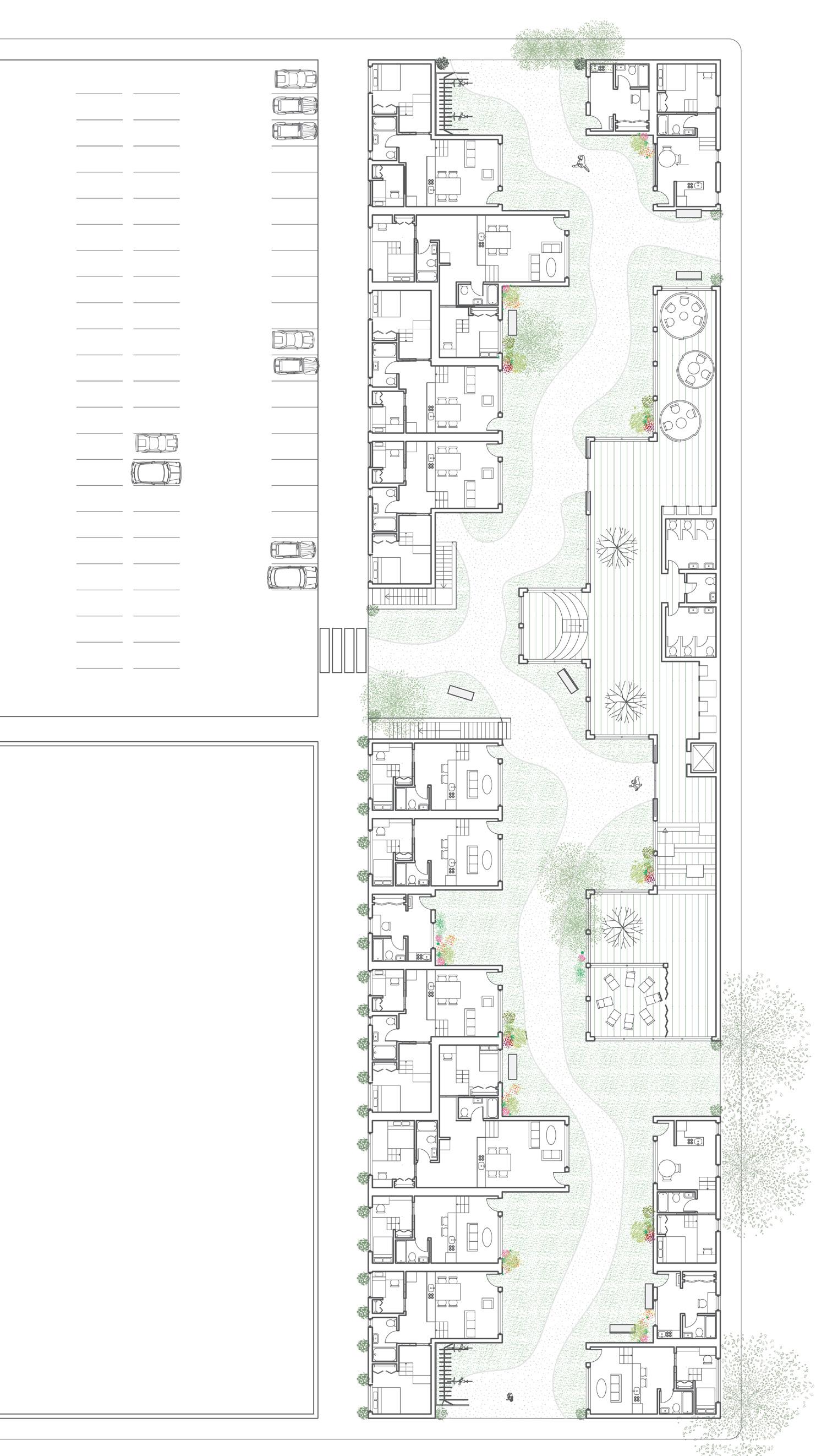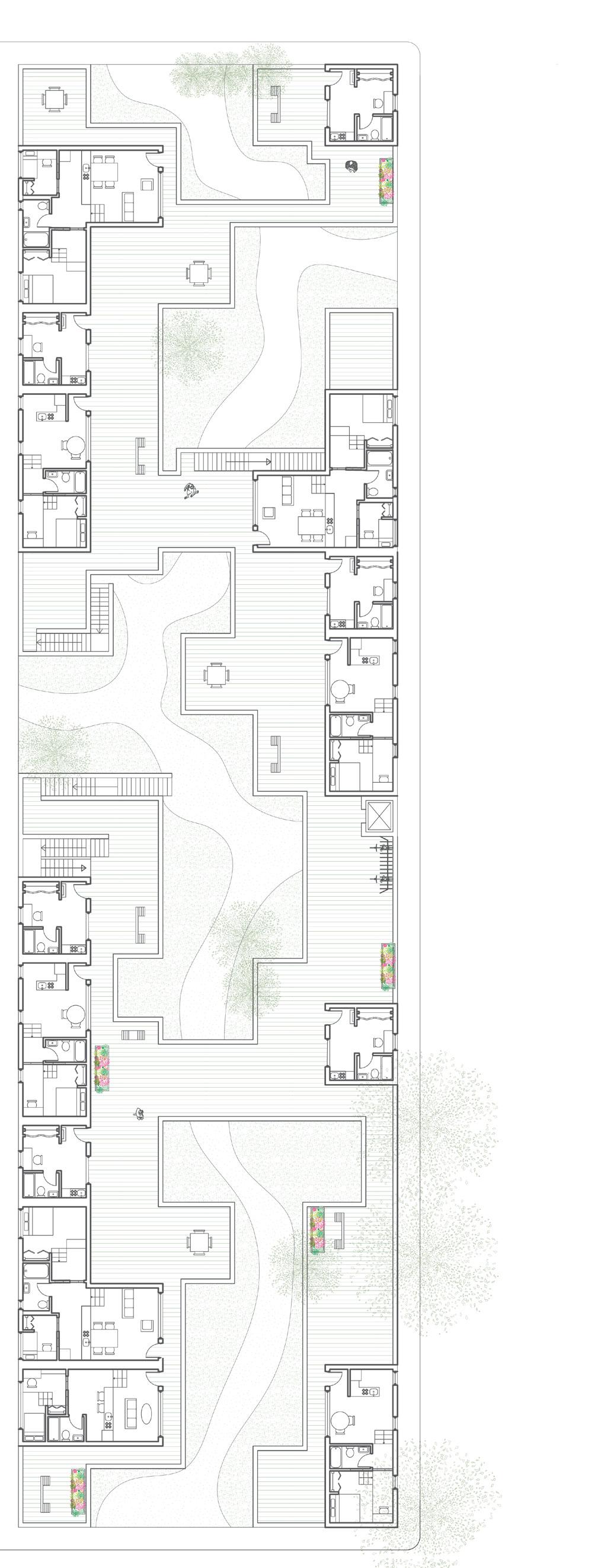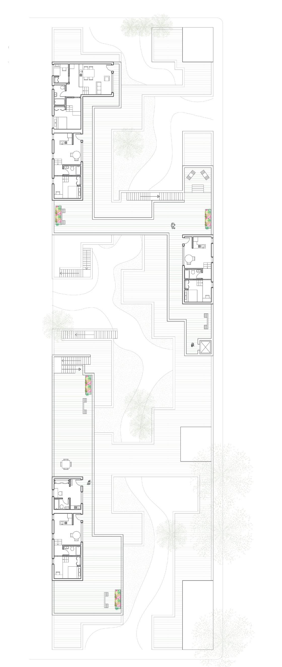 The second concept is the sharing of space. Although individual units within the building are on a smaller scale, the project, by providing expansive communal areas, expands the using area for the residents of this project. These interstitial spaces between units serve as gathering spots, fostering interaction among residents while offering additional amenities for the entire neighborhood.