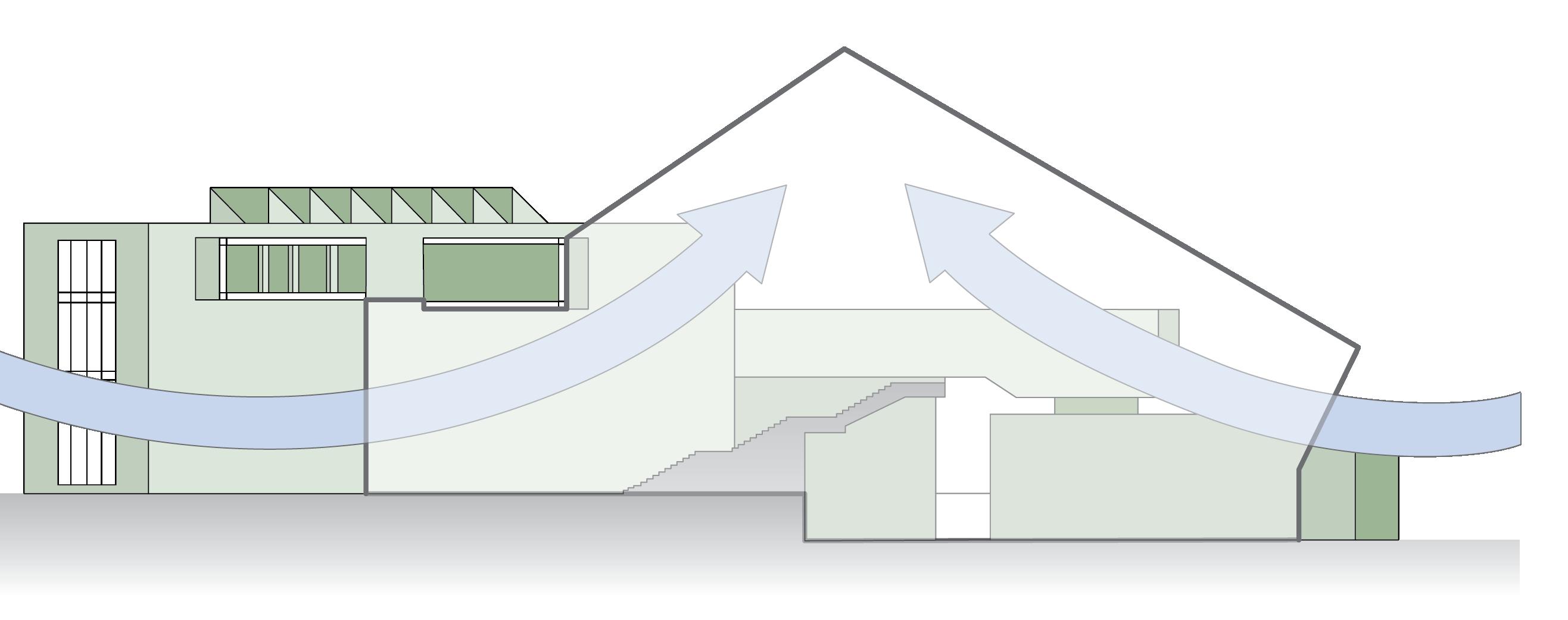 One of the critical parts of this complex is the interaction with the nature. There are four types of space in this complex. Outdoors, covered outdoors, conditioned outdoors, and indoors. Each space could be sued for different purposes based on the needs and advantages of each space. The conditioned space, specifically the courtyard also serves as a space which generates stack effect and venturi effect. When the air gets heated in hot summer day, it rises and by letting them out on the top of this high structure, and with the help of social stairs, the glass courtyard will generate natural air circulation with help of the social stairs. Venturi effect would also happen due to the narrow opening that makes a pathway to all cardinal direction, which also promotes open access to neighborhoods. By controlling the pathways, airflow will naturally cool down the atrium in hot sunny days, and warm up the space with the aid of greenhouse effect.