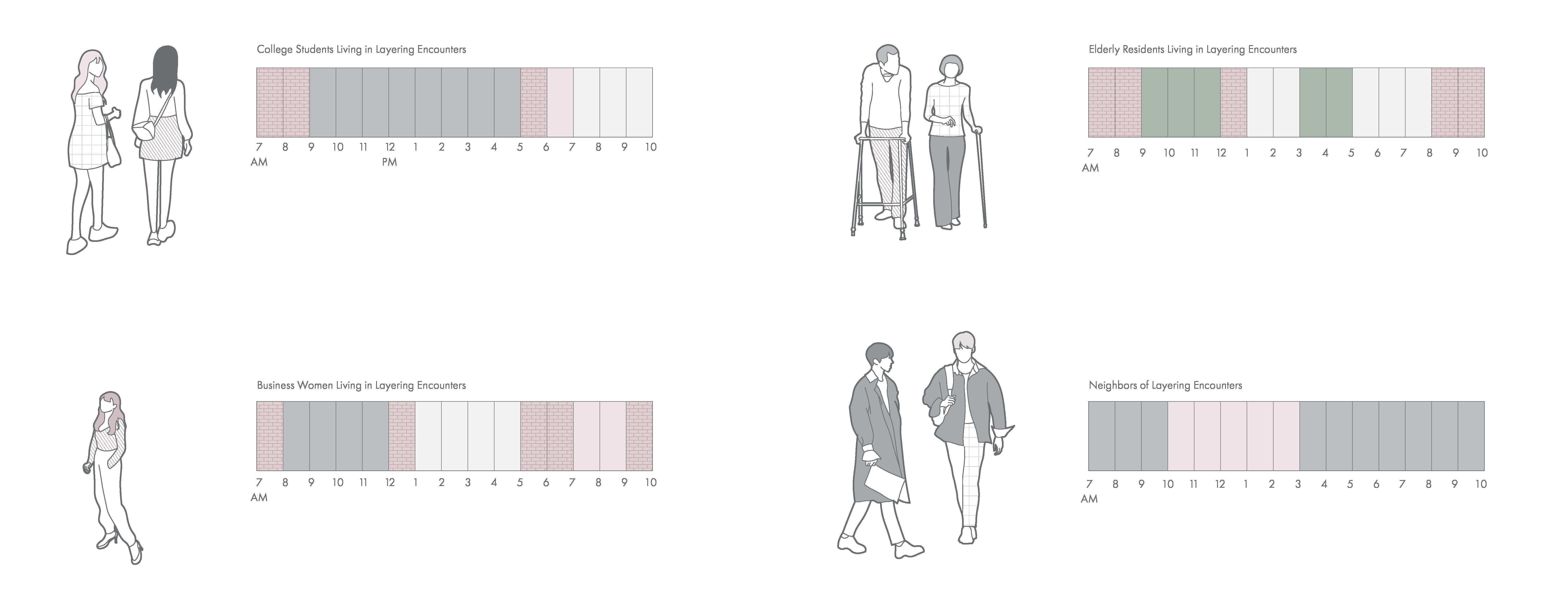 Located along Connecticut Avenue in Washington, DC, Layering Encounters addresses urban living through the integration of community-focused design. Woodley Park area, a prominent historical district, currently faces gentrification, isolation, and lack of spatial connection. This causes a lack of community bonds and poor navigability due to large apartments blocking the neighborhood fabric.