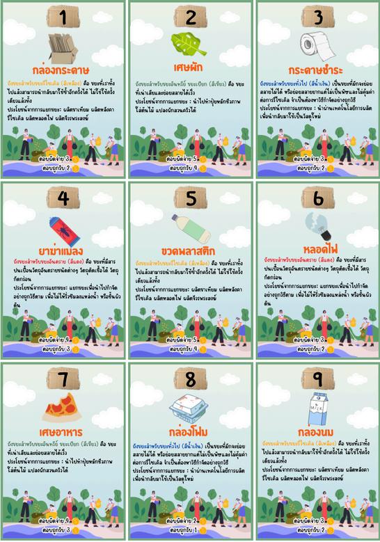 ถงขยะสาหรบขยะรไซเคล (สเหลอง) ถงขยะสาหรบขยะอนทรย ขยะเปยก (สเขยว) ถงขยะสาหรบขยะทวไป (สนาเงน) คอ ขยะทเราทงไปแลวสามารถนากลบมาใชซาอก ครงได ไมใชใชครงเดยวแลวทง ประโยชนจากการแยกขยะ: ผลตขาเทยม ผลต หลงคารไซเคล ผลตหลอดไฟ ผลตจวรพระสงฆ คอ ขยะทเนาเสยและยอยสลายไดเรว ประโยชนจากการแยกขยะ : นาไปทาปยหมก ชวภาพ ใสตนไม แปลงผกสวนครวได เปนขยะทมกจะยอยสลายไมได หรอยอยสลาย ยากแตไมเปนพษและไมคมคาตอการรไซเคล จาเปนตองหาวธกาจดอยางถกวธ ประโยชนจากการแยกขยะ : นาผานเทคโนโลย การผลตเพอนากลบมาใชเปนวสดใหม คอ ขยะทมสารปนเปอนวตถอนตรายชนดตางๆ วตถตดเชอได วตถกดกรอน ประโยชนจากการแยกขยะ: แยกขยะเพอนาไป กาจดอยางถกวธตาม เพอไมไหรวซมลงแหลงนา หรอชนผวดน