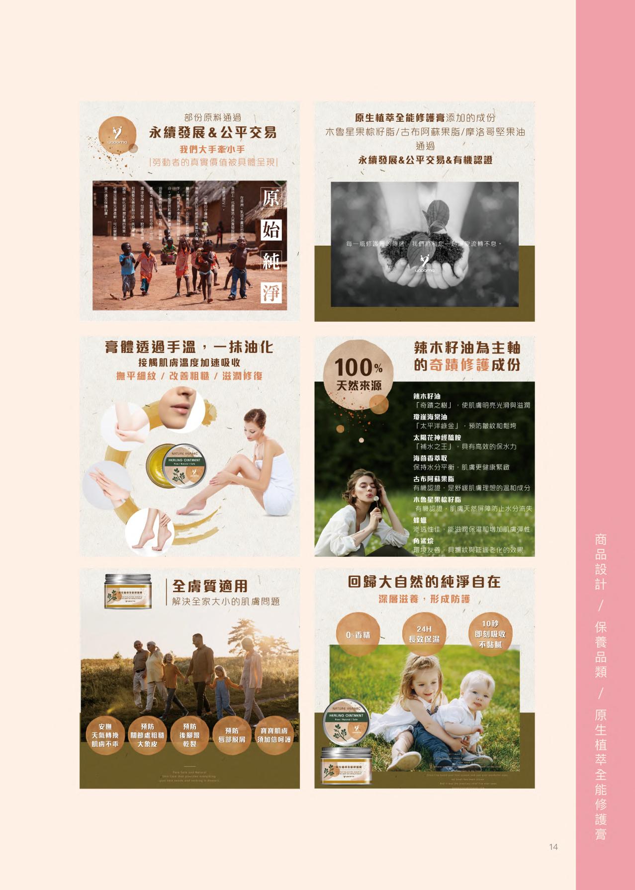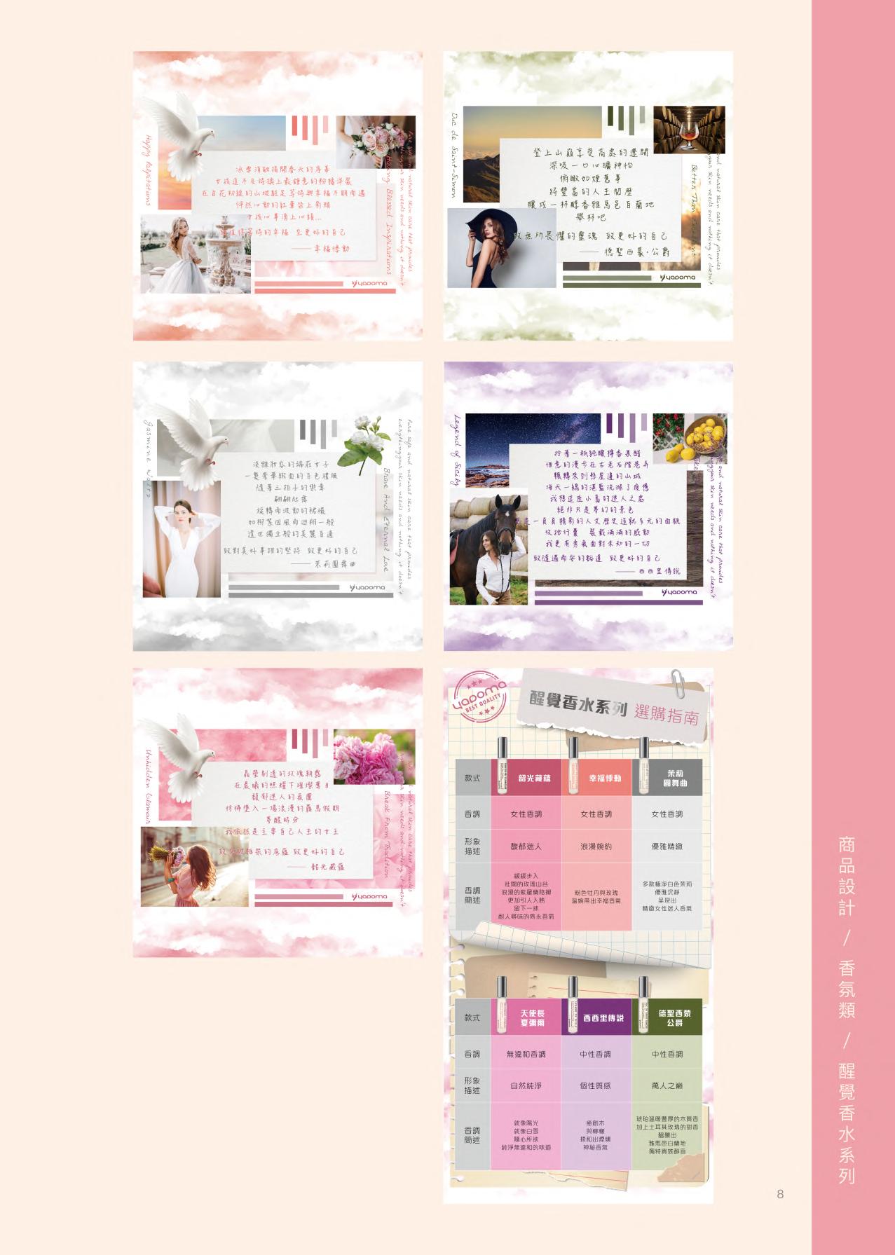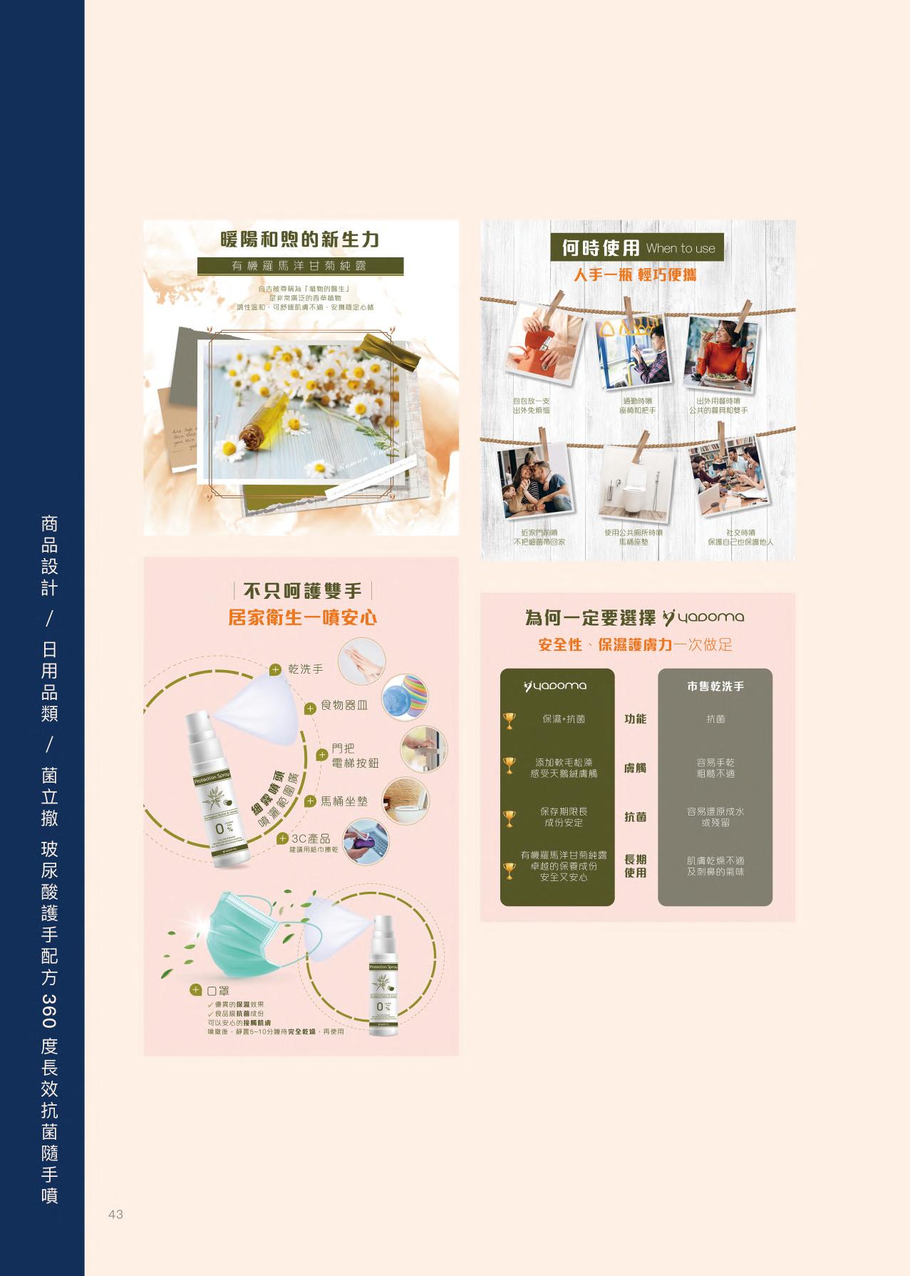 2018年4月任職「雙禔生物科技 有限公司」與該公司旗下品牌「yadoma肌膚心感動」的 行銷設計人員。由於公司是中小 企業,一人身兼多職,從產品行銷企劃,到產品包裝設計 與發包量產,以及網站產品上架與管理後台、訂單客服均需一人獨立完成,練就工作效率 與解決問題的能力。