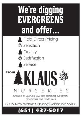 Designed to offer a high-quality snowblower that proves to be robust & reliable, thus delivering extraordinary performance & durability. The hardox in my body stickers certify you the use of a very high quality steel for the most used components of the normand commercial and Industrial series snowblowers. We use the hardox 450 because we want our snowblowers to be both sturdy and lightweight. YBRID IES LOCATED IN MIESVILLE BETWEEN HASTINGS AND RED WING ON HWY 61. CONTACT YOUR NIEBUR TRACTOR & EQUIPMENT REPRESENTATIVE FOR MORE INFORMATION ABOUT NORMAND PRODUCTS. 651.437.3531 | 888.559.9492 NIEBURTRACTOR.COM 14380 E 240TH ST. HASTINGS, MN 55033 Measuring up to the best for oVer 40 years! your partner for: • Native and cultivar trees • Shade, ornamental, and evergreens • Superior quality B&B packaging • Air pruning and traditional containers • Caliper sized bare root trees • Prompt and flexible delivery hoffMan & McnaMara NurSery ANd LANdSCAPe 9045 180th St. east • Hastings , MN 55033 • phone: 651-437-9463 fax: 651-437-9050 • e-Mail: info@hoffmanandmcnamara.com www.hoffmanandmcnamara.com Arlington Ave W Maryland Ave W Jackson St Rice St 35E Ready, Set... SNOW! ICE MELTER AVAILABLE Conveniently located off of I-35E between Arlington Ave & Maryland Ave 1375 Trout Brook Circle, St. Paul, MN 855-487-8108 www.carlinsales.com ORDER ONLINE Pro-Melt 50 lb Bag, 49/plt Call to get quotes on full truckload deliveries! Quad Release 50 lb Bag, 50/plt Ice Melter 50 lb Bag, 49/plt