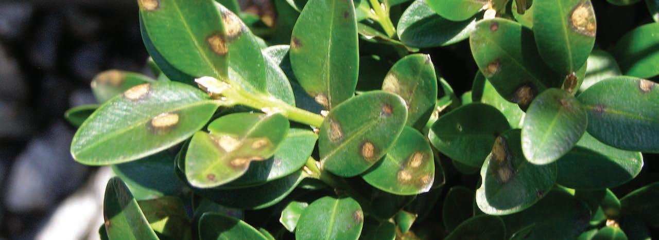 Holiday wreaths, garlands, and planters often contain shoots from boxwood plants. Boxwood is an evergreen shrub with dark green, rounded leaves. Boxwood blight is caused by the invasive fungus Calonectria pseudonaviculata. This disease causes leaf spots, stem lesions, and leaf drop in boxwoods.