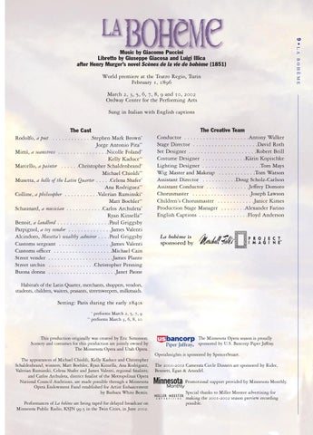 World premiere at the Teatro Regio, Turin February 1, 1896 March 2, 3, 5, 6, 7, 8, 9 and 10, 2002 Ordway Center for the Performing Arts Sung in Italian with English captions The Cast Rodolfo, a poet . . . . . . . . . . . . .Stephen Mark Brown* Jorge Antonio Pita** Mimì, a seamstress . . . . . . . . . . . . . . . .Nicolle Foland* Kelly Kaduce** Marcello, a painter . . . . . .Christopher Schaldenbrand* Michael Chioldi** Musetta, a belle of the Latin Quarter . . . . .Celena Shafer* Ana Rodriguez** Colline, a philosopher . . . . . . . . . . .Valerian Ruminski* Matt Boehler** Schaunard, a musician . . . . . . . . . . . .Carlos Archuleta* Ryan Kinsella** Benoit, a landlord . . . . . . . . . . . . . . . . .Paul Griggsby Parpignol, a toy vendor . . . . . . . . . . . . . .James Valenti Alcindoro, Musetta’s wealthy admirer . . . .Paul Griggsby Customs sergeant . . . . . . . . . . . . . . . . .James Valenti Customs o∑cer . . . . . . . . . . . . . . . . . . .Michael Cain Street vender . . . . . . . . . . . . . . . . . . . . .James Plante Street urchin . . . . . . . . . . . . . . .Christopher Penning Buona donna . . . . . . . . . . . . . . . . . . . . . .Janet Paone