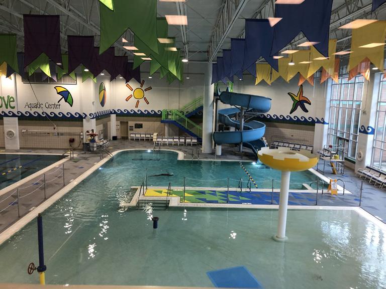 This indoor-outdoor facility includes a leisure pool with a zero-depth beach area, water-spray activities, a 130-foot water slide and a tot slide. The indoor lap pool features 25-yard lanes and a rope swing that drops into a 12-footdeep pool.