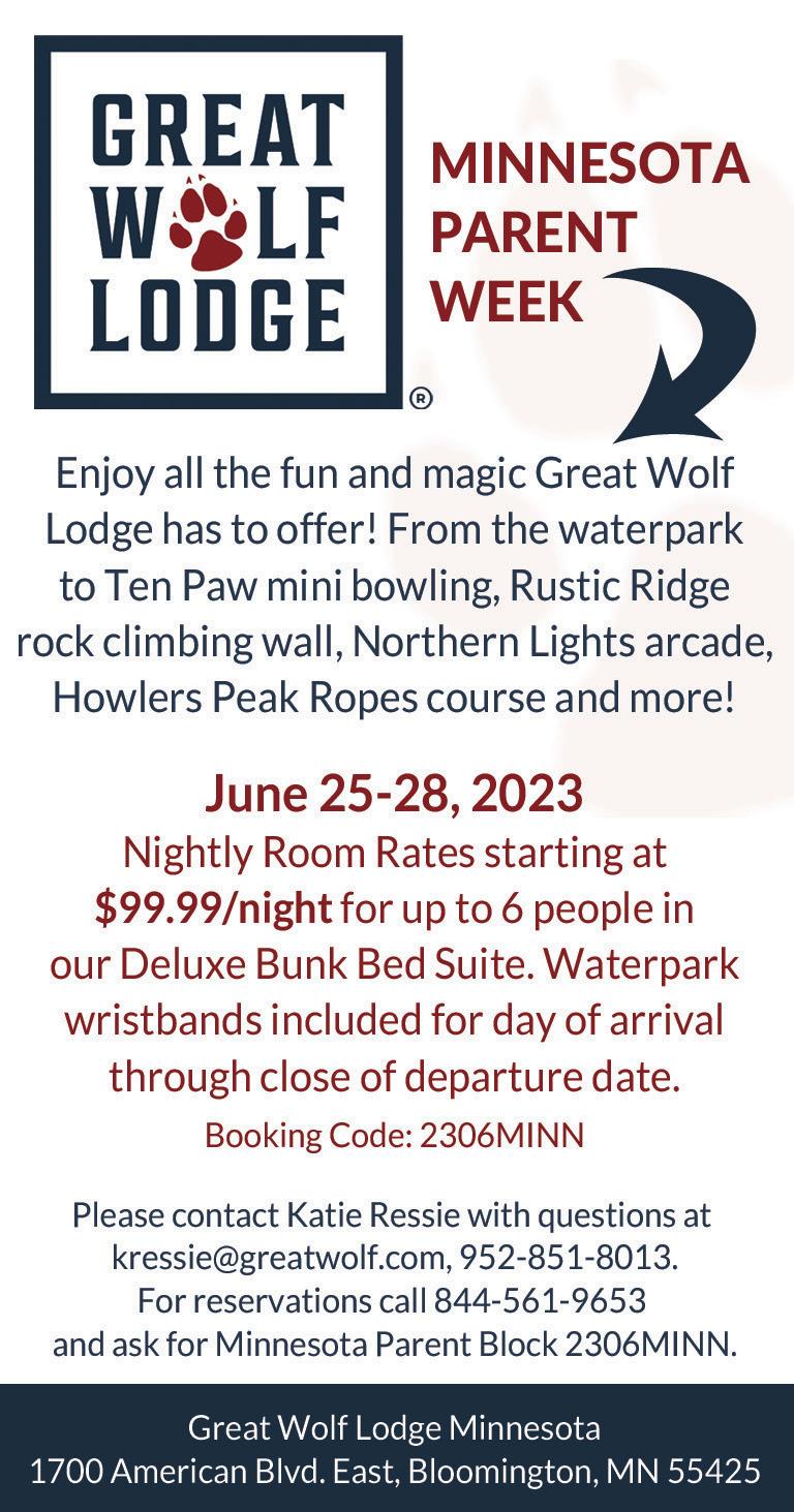 Experience a world of play where you can splash, play, eat and relax together, all under one roof. Go with the flow in the water park resort or find adventurous dry-play throughout the lodge — with over 50+ attractions including a resort-wide digital scavenger hunt known as MagiQuest. Bloomington • greatwolf.com/minnesota