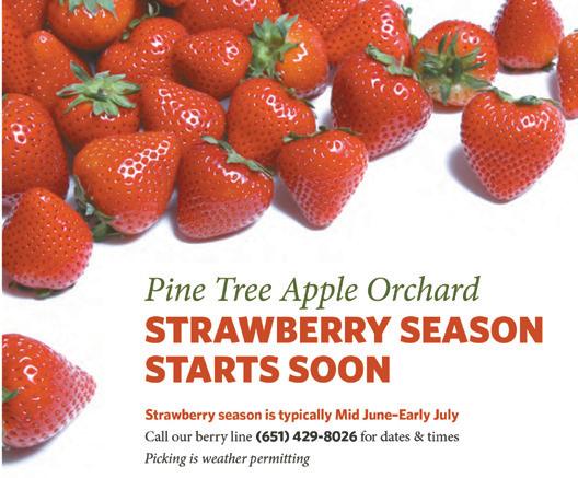 XXXXXX Strawberry Season Starts Mid June - Early July! Pick your own • Picked for you • Strawberry bakery Visit website for more information Apple season mid August to March Apples, Appes, Apples Apples in pies, apples in dougnuts, rollovers, muffins, cider and caramel apples. Enjoy special events and family fun. Corn maze, pick your own pumpkins. C’mon out... this is the place to make you smile. APPLE BAKERY, (651) 429-7202 PICKED FOR YOU, (651) 429-7202 STRAWBERRY BAKERY, (651) 429-7202 See our website for strawberry information & fall events pinetreeappleorchard.com (651) 429-7202 North of White Bear Lake off East Hwy 96