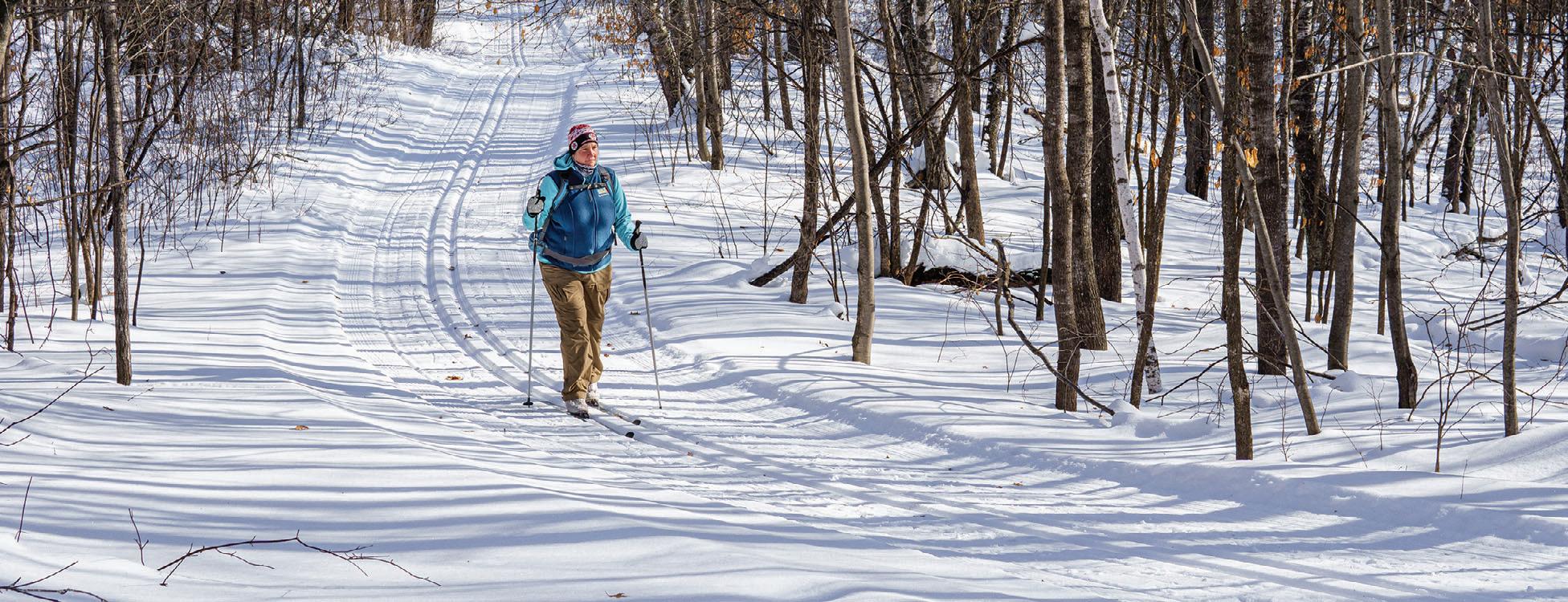 The 400-acre grounds of the Northland Arboretum are home to 12km of classic and skate ski trails and several miles of snowshoe and hiking trails. The visitor center provides restrooms and a place to warm up between ski rounds. The Paul Bunyan State Trail is the western border of this preserve. We fashioned a nice loop out of the Ojibwe and Acorn trails, both of which make up the Arboretum’s lighted trail system for night skiing. It was a crisp 5 degrees when we started, but it didn’t feel cold. There was no wind, the sun was strong, and the skiing was wonderful. We glided along through the oaks and pines and enjoyed every minute of it.
