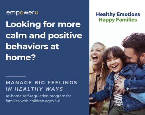 Families with children ages 3-8 Are you looking for more calm and positive behaviors at home? This online, plug-and-play program teaches families self-regulation skills that help them better manage big feelings and disappointments in a calm and consistent manner. Parents/ caregivers and children complete the 11 fun, engaging 20- minute online lessons together at home each week. Through interactive videos, digital books and scripted family activities, both parent/ caregiver and child learn concrete tools that help them take charge of their emotions and behaviors in a healthy way, creating a more joyful and peaceful home.
