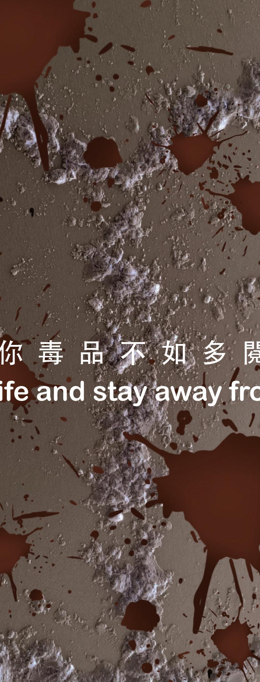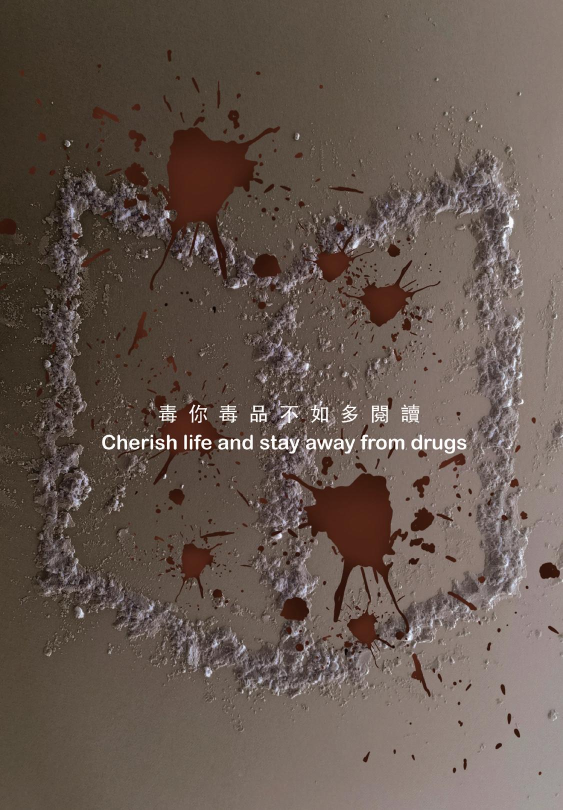 視覺以粉末的方式表達毒品,且運用血漬來警惕,吸毒對於自身的 危害,想表達出珍愛生命遠離毒品的重要性。
