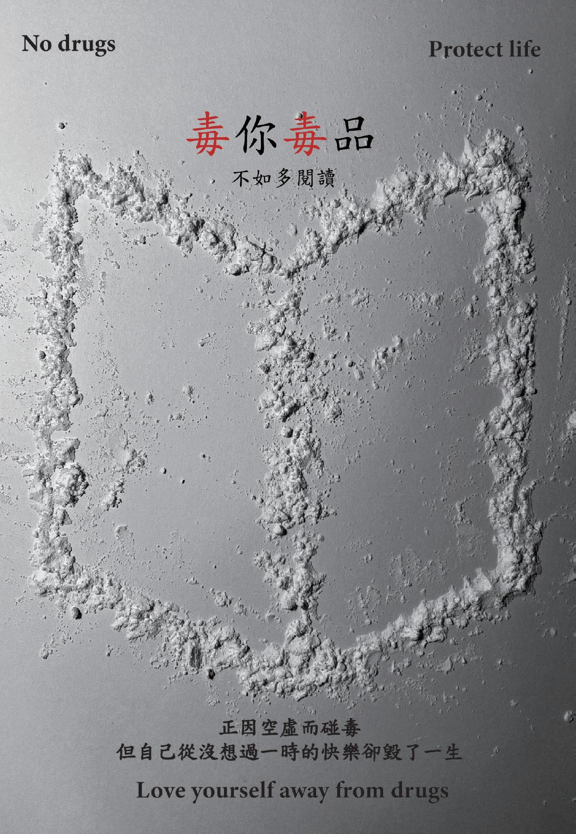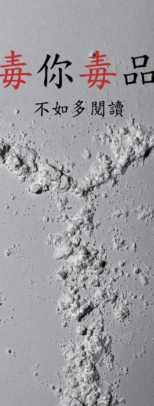 視覺以粉末的方式表達毒品,且排列書本的樣式,表達出吸毒還不 如多閱讀,且珍愛生命遠離毒品的重要性。