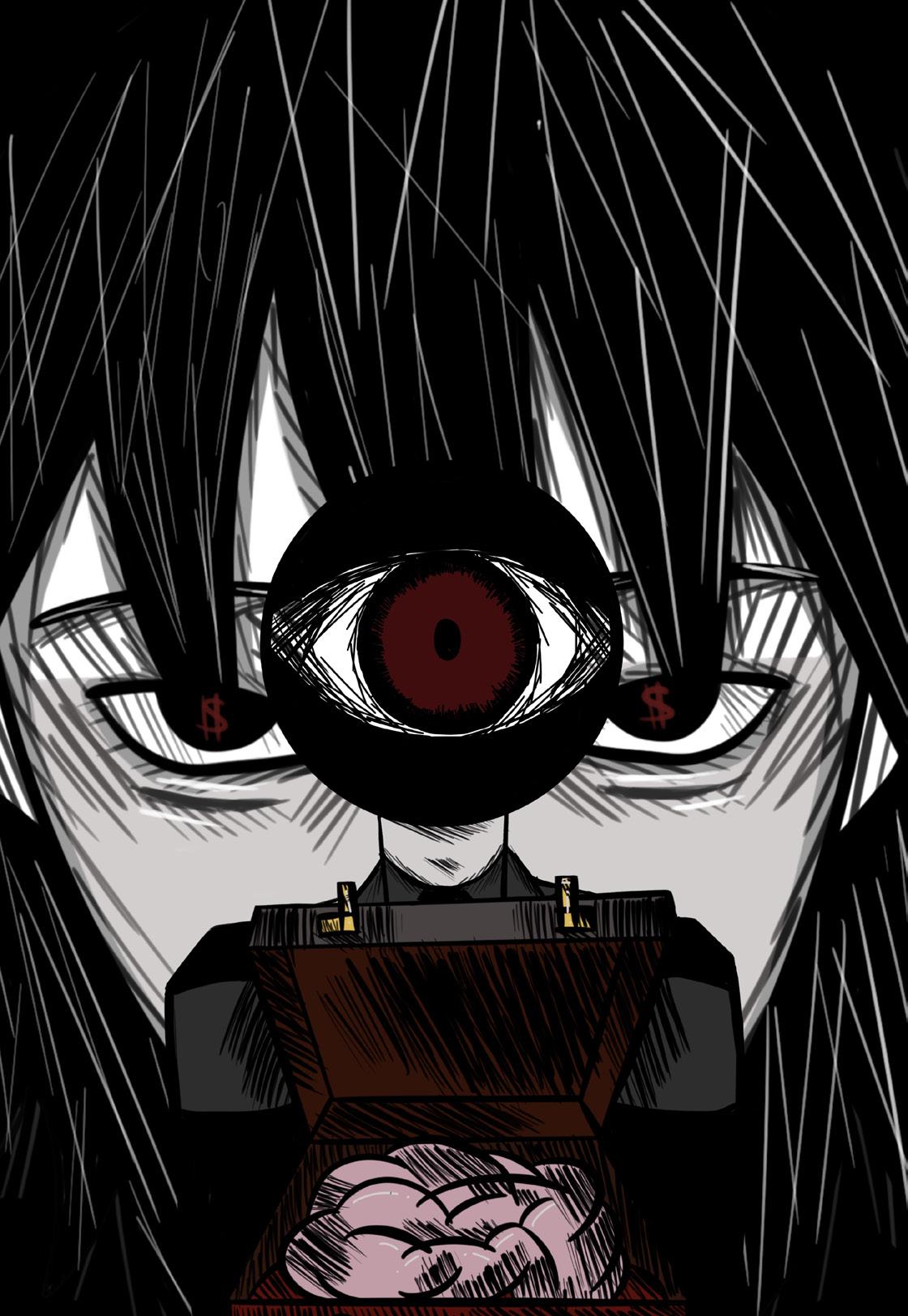 以眼睛器官為主視覺,表達出眼中物品代表著自我的慾望,當想法 裡浮現了野心,那麼人們都會執著自己沒有擁有的寶物,人們都被 自己的野心有所瘋狂。
