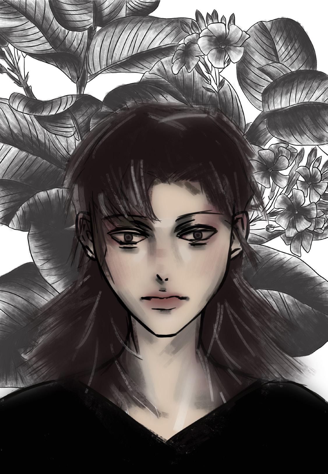 以人物為視覺中央,搭配上樹葉和花,散發著神秘的氛圍,希望以 視覺呈現方式,能夠帶來想像中的那個香氛。