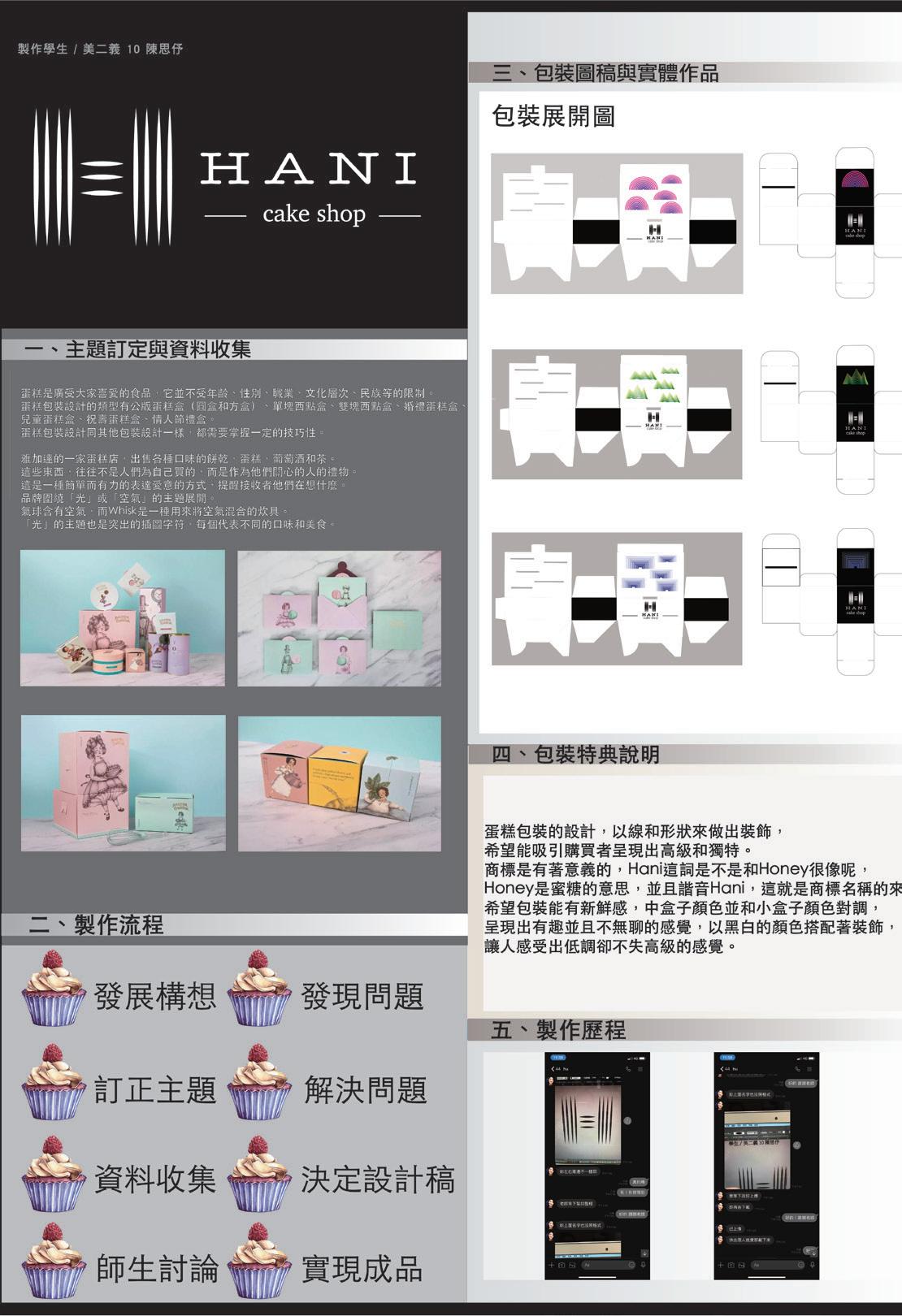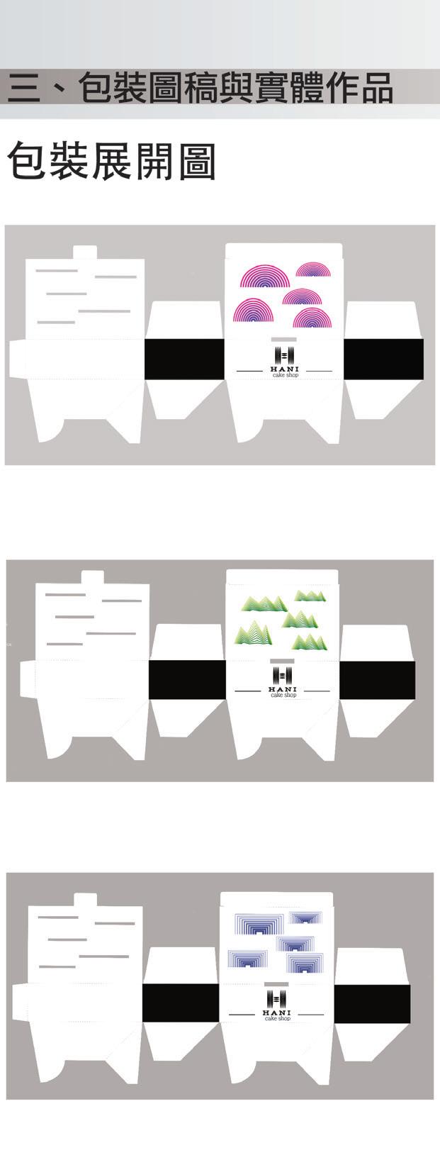 蛋糕包裝的設計,以線和形狀來做出裝飾,希望能吸引購買者呈現 出高級和獨特。商標是有著意義的,Hani這詞是不是和Honey 很像呢,Honey是蜜糖的意思的。