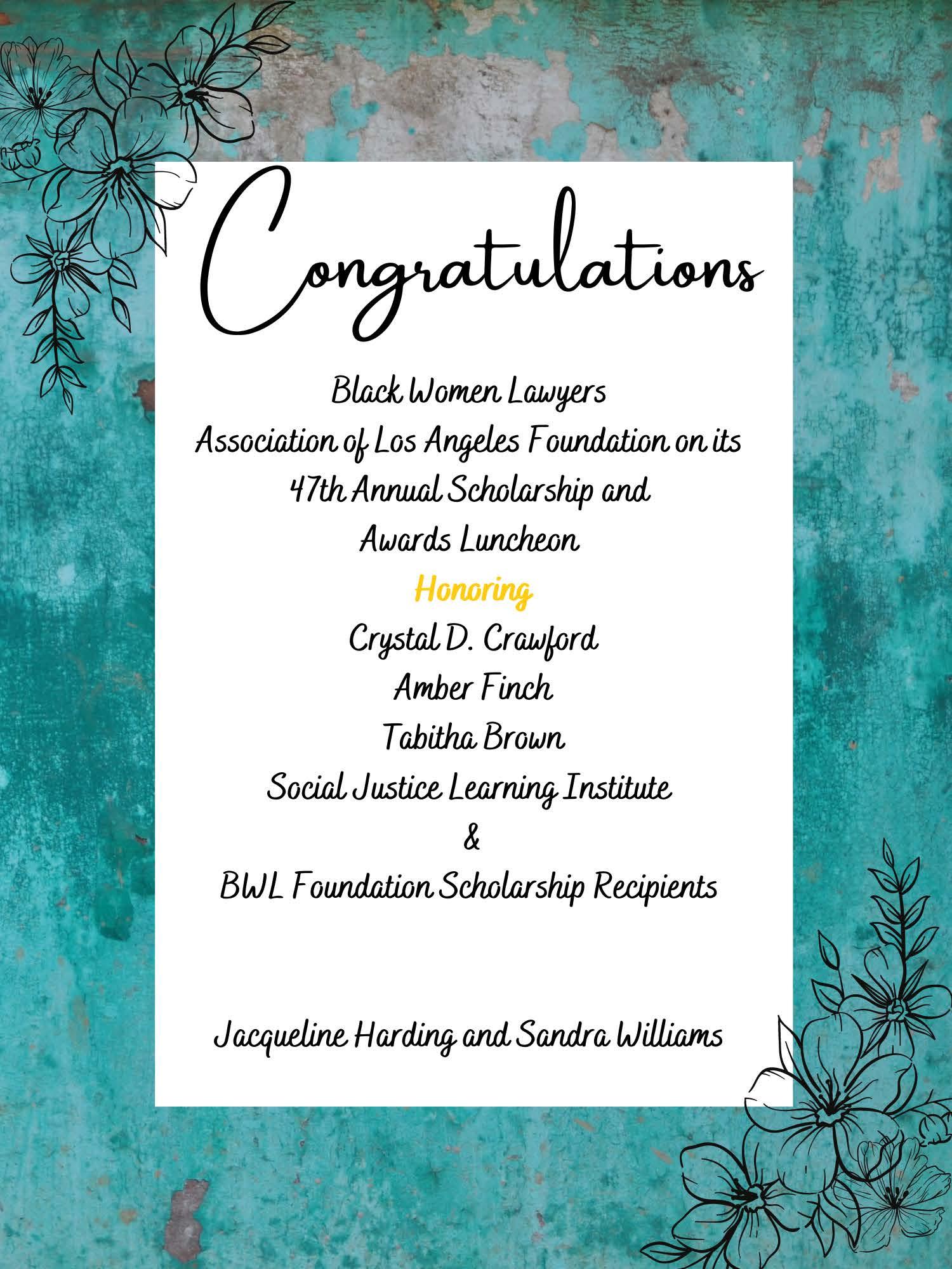 On behalf of the 2022-2023 Board of Officers and Committee Chairs of Black Women Lawyers Association of Los Angeles, Inc. (“BWL”), welcome to the 47th Annual Scholarship Fundraiser & Awards Luncheon! Today promises to be a truly special event celebrating the achievements of four outstanding honorees and recognizing the future of the legal profession in our 2023 scholarship recipients.