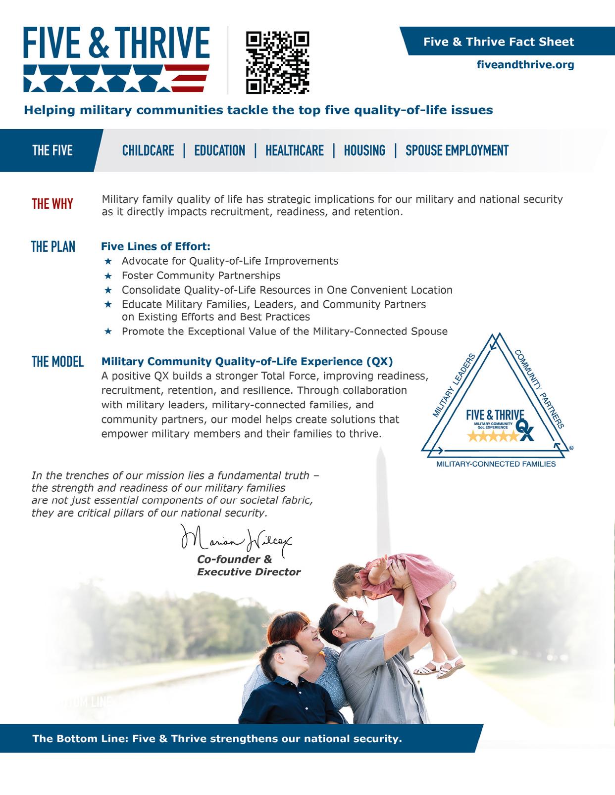 That’s why we’re proud to be part of Five & Thrive – a national initiative focused on addressing the top five quality-of-life issues that impact military families: child care, education, healthcare, housing, and spouse employment. These are big topics, and we’re actively working with local partners to move the needle in every area. When military families thrive, our entire community thrives!