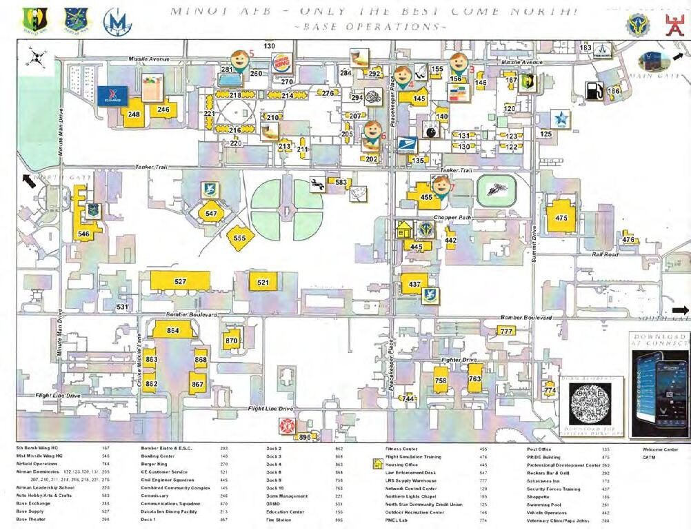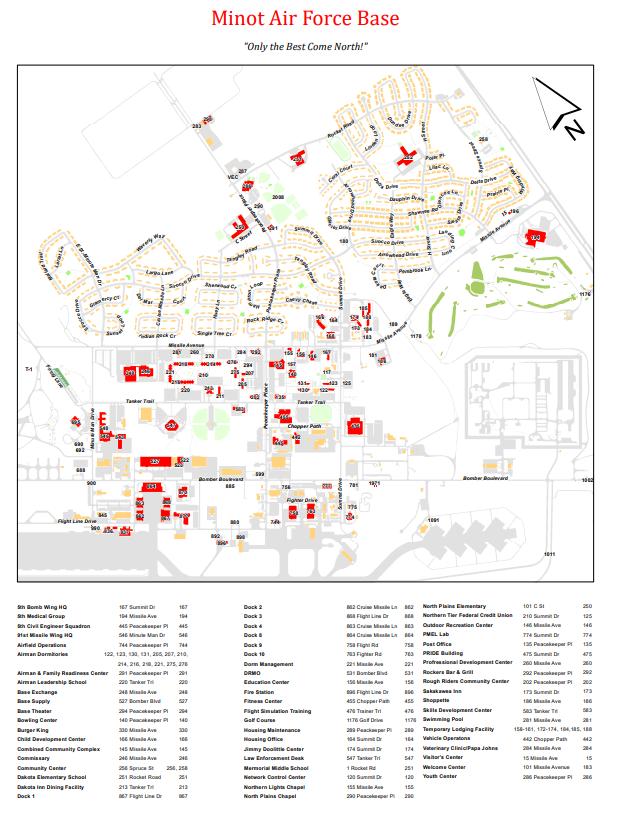 A directory of phone numbers related to services and offices around the base is available on the Minot AFB 5th Force Support Squadron Website.