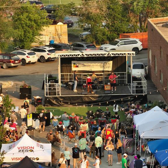 While there are formal events planned for the space —including live music, art events, markets, outdoor movies, and a grand opening on Aug 11—people are invited to enjoy the space anytime. Murals line the alley, trees and flowers add welcomed green space, and stings of globe lights offer a bit of magical ambiance after dark. A pop-jet fountain is near completion and basketball and pickleball will be available soon, static seating will be installed, and lawn games are available for visitors to use; in the winter, a skating rink will fill a portion of the space.