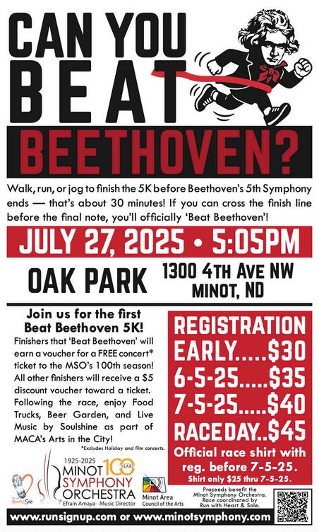 “I am thrilled to bring the Beat Beethoven 5K to Minot after hearing about its popularity across the country at the League of American Orchestras conference,” said Ellen Fenner, Executive Director of the Minot Symphony Orchestra “It’s such a fun and creative way to connect the community with classical music, promote wellness, and kick off our 100th season celebration We can’t wait to see Minot rise to the challenge and try to ‘Beat Beethoven’!”