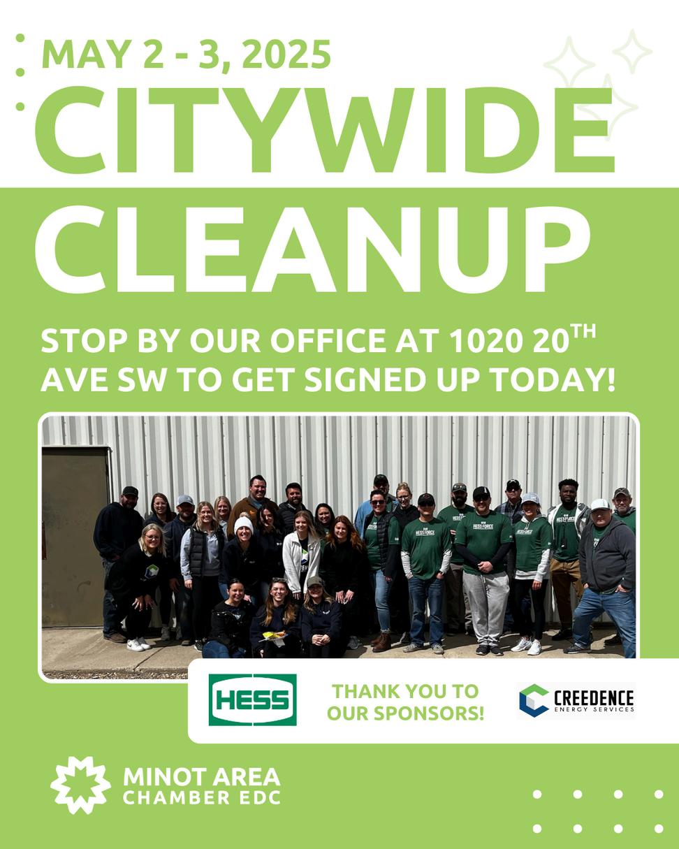 Thanks to Hess Corporation and Creedence Energy Services as presenting sponsors of the clean-up. Their sponsorship supports the overall program and will provide volunteers with the tools to help clean up our community Contact Carla Dolan at the Chamber EDC with any questions carla@minotchamberedc com or 701-8578205