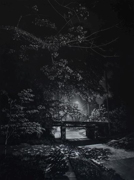 Also on view is a solo exhibition by 2024 All Media Best of Show, mezzotint printmaker Jacob Crook His exhibition, “Umbrae,” features dark and contemplative scenes that set the stage for viewers to consider their own associations with the imagery. He emphasizes the ability of light to transform an image from the mundane to the magical, whether showing an abandoned interior commercial space, or a quiet and empty street at night.