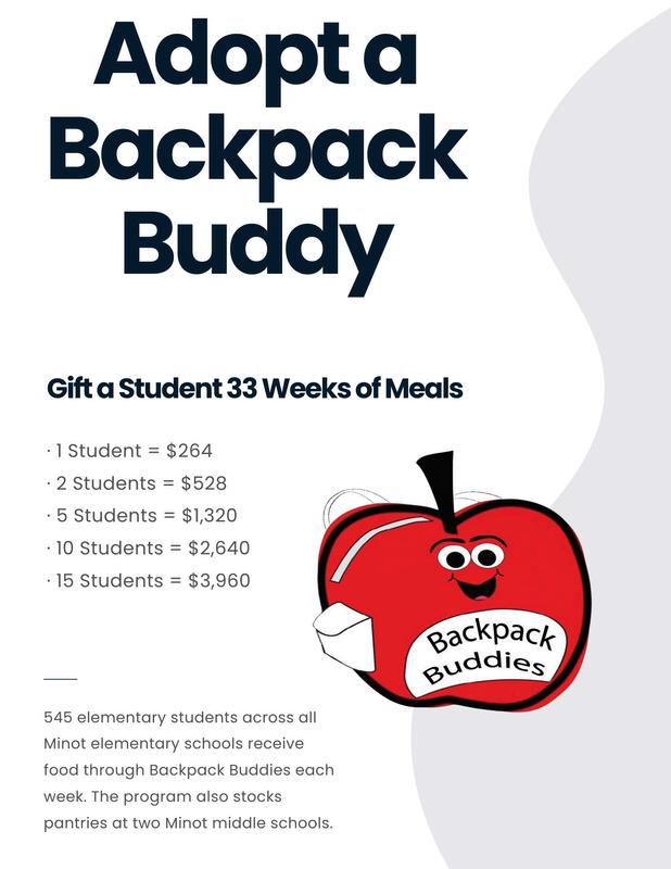 The Souris Valley United Way’s Backpack Buddies program is currently feeding more than 547 elementary students in Minot each week Recipients are identified by school counselors and teachers as children who might otherwise go hungry on weekends The Backpack Buddies program provides food security for children in all 10 elementary schools in Minot, and stocks pantries at Jim Hill and Central middle schools