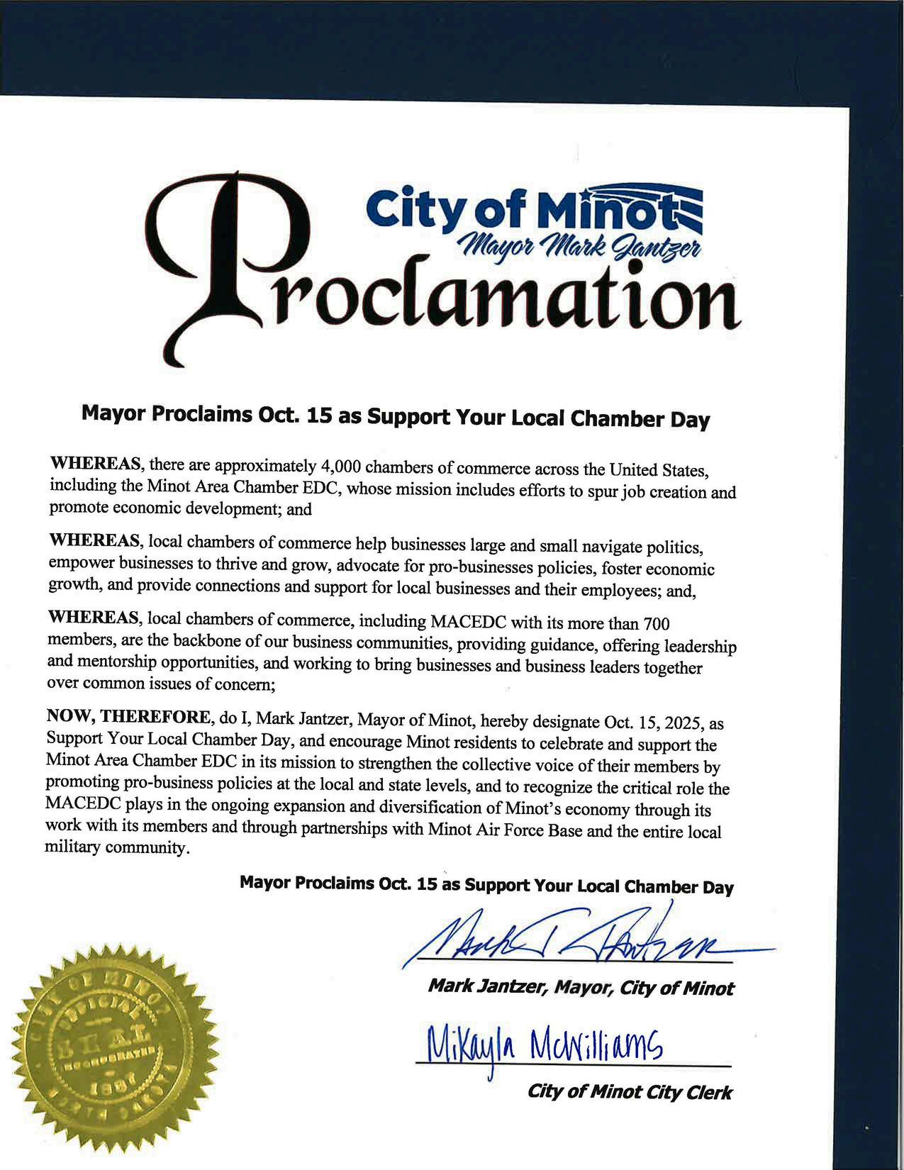 Minot Area Chamber EDC continues to serve as the lead organization for economic development, workforce development, and military support through Task Force 21 for the City of Minotand regional economic development through our partnership with Ward County. Both the City of Minot and Ward County reaffirmed this role during their 2026 budget hearings, allocating funding for MACEDC’s work in the coming year